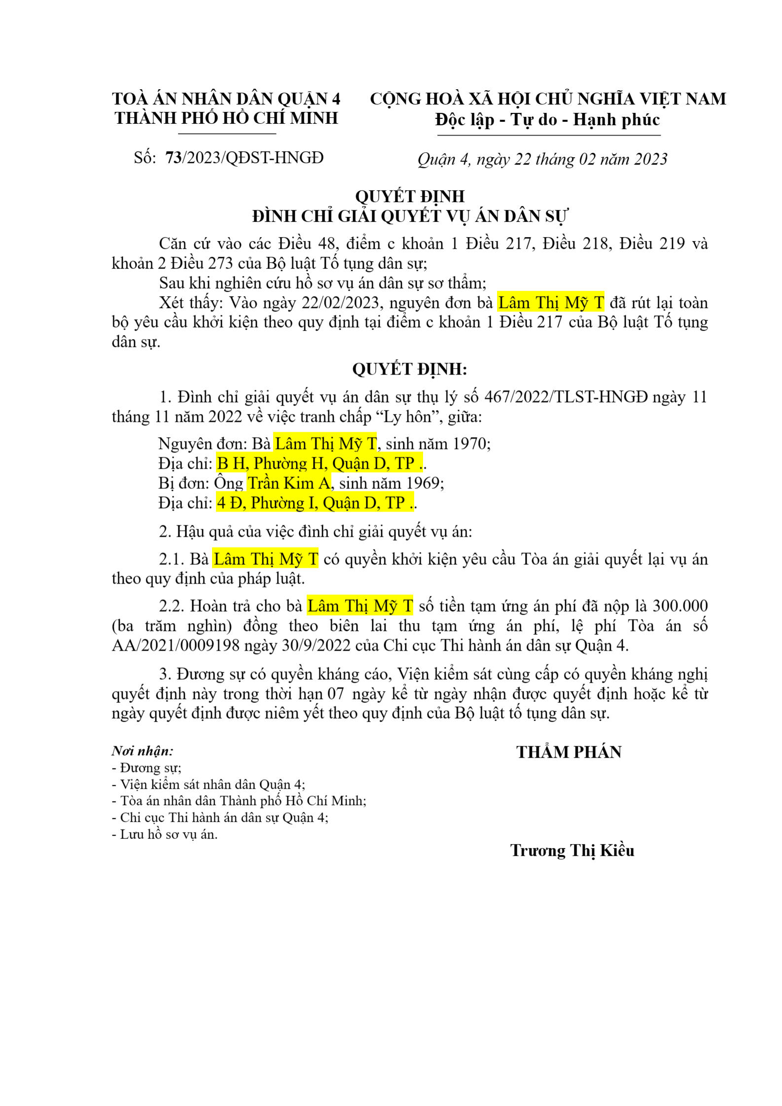 Quyết định số 73/2023/QĐST-HNGĐ ngày 22/02/2023 của TAND Quận 4, TP. Hồ Chí Minh về vụ án ly hôn về mâu thuẫn gia đình