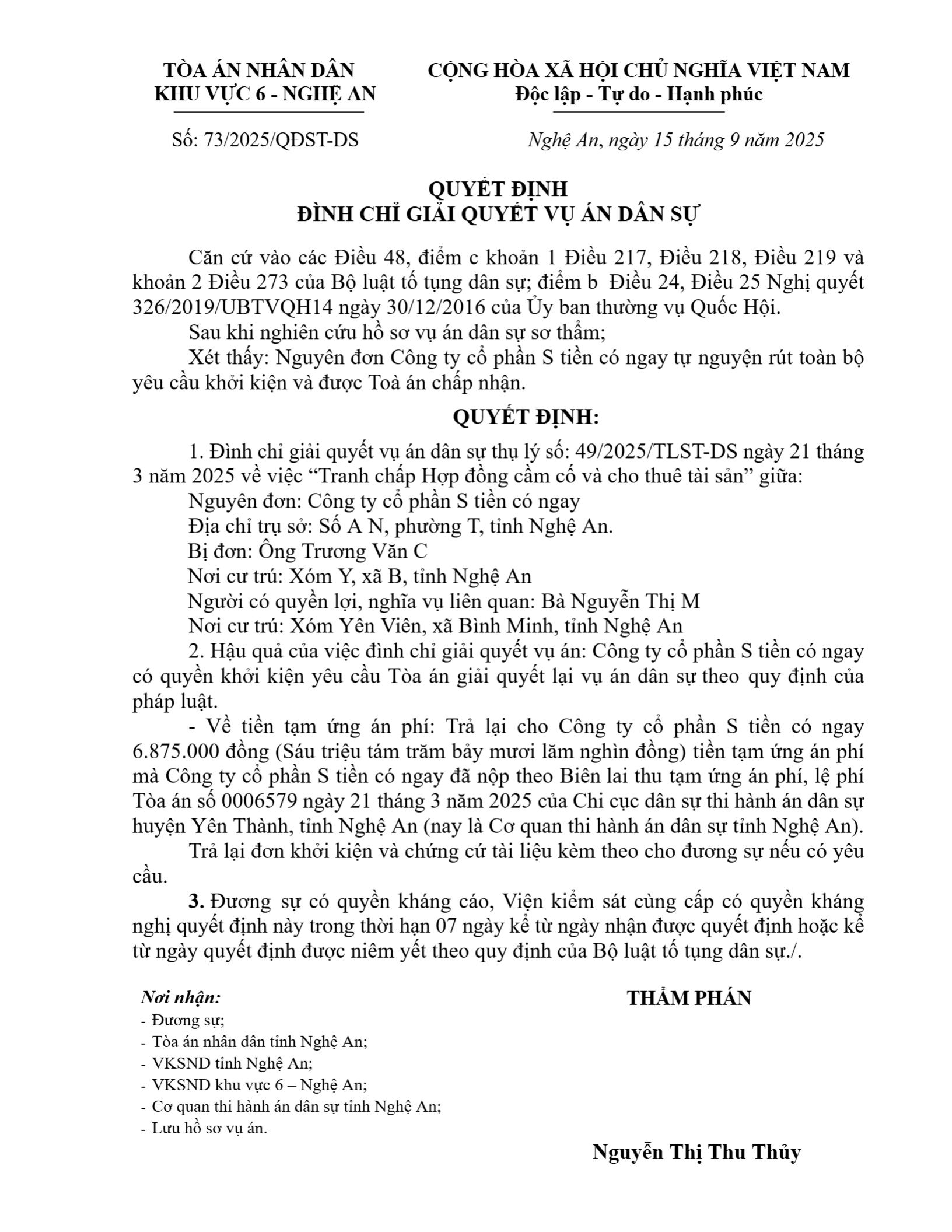 Quyết định số 73/2025/QĐST-DS ngày 15/09/2025 của Tòa án nhân dân khu vực 6 - Nghệ An, tỉnh Nghệ An về tranh chấp hợp đồng thuê tài sản