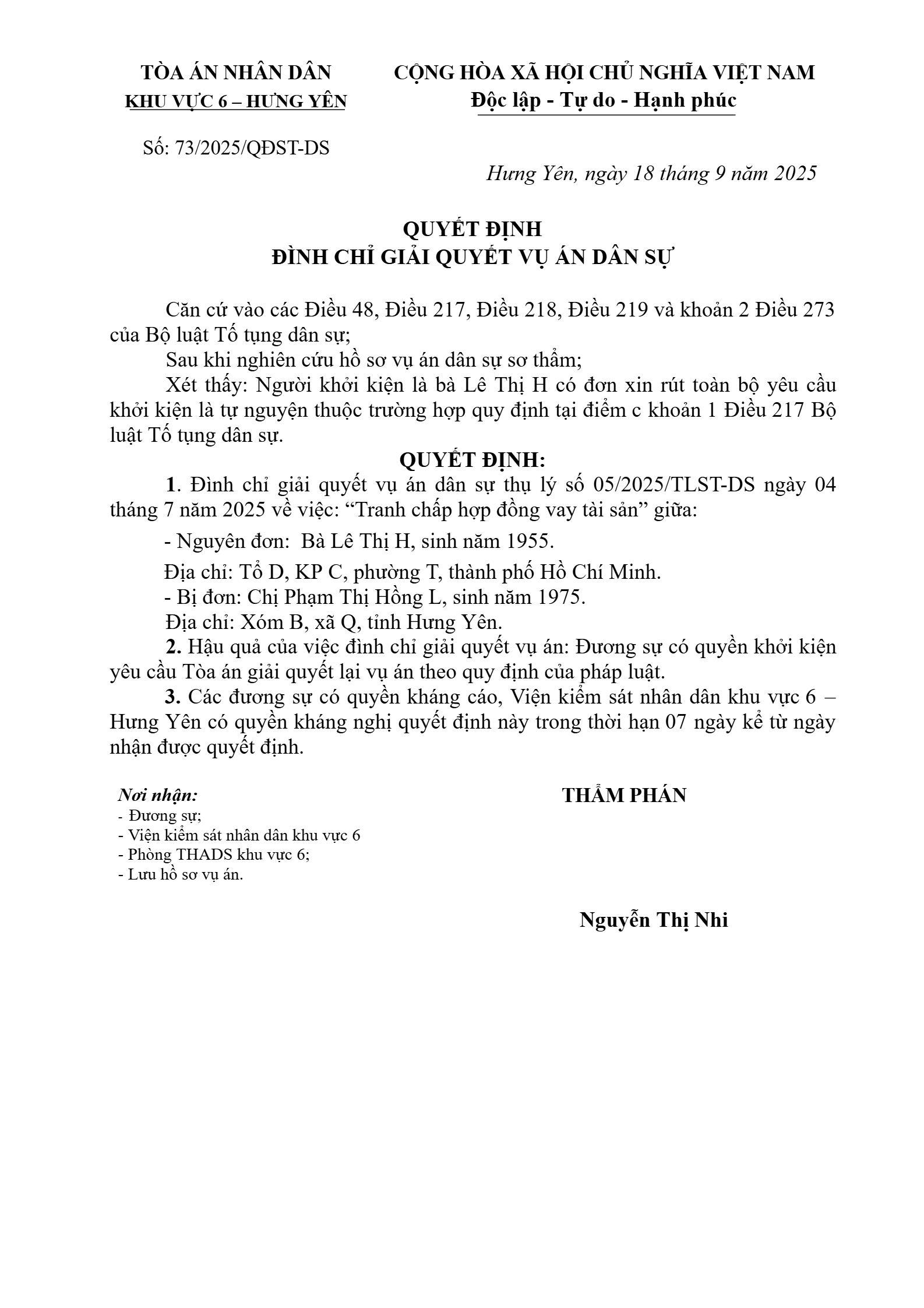 Quyết định số 73/2025/QĐST-DS ngày 18/09/2025 của Tòa án nhân dân khu vực 6 - Hưng Yên, tỉnh Hưng Yên về tranh chấp hợp đồng vay tài sản