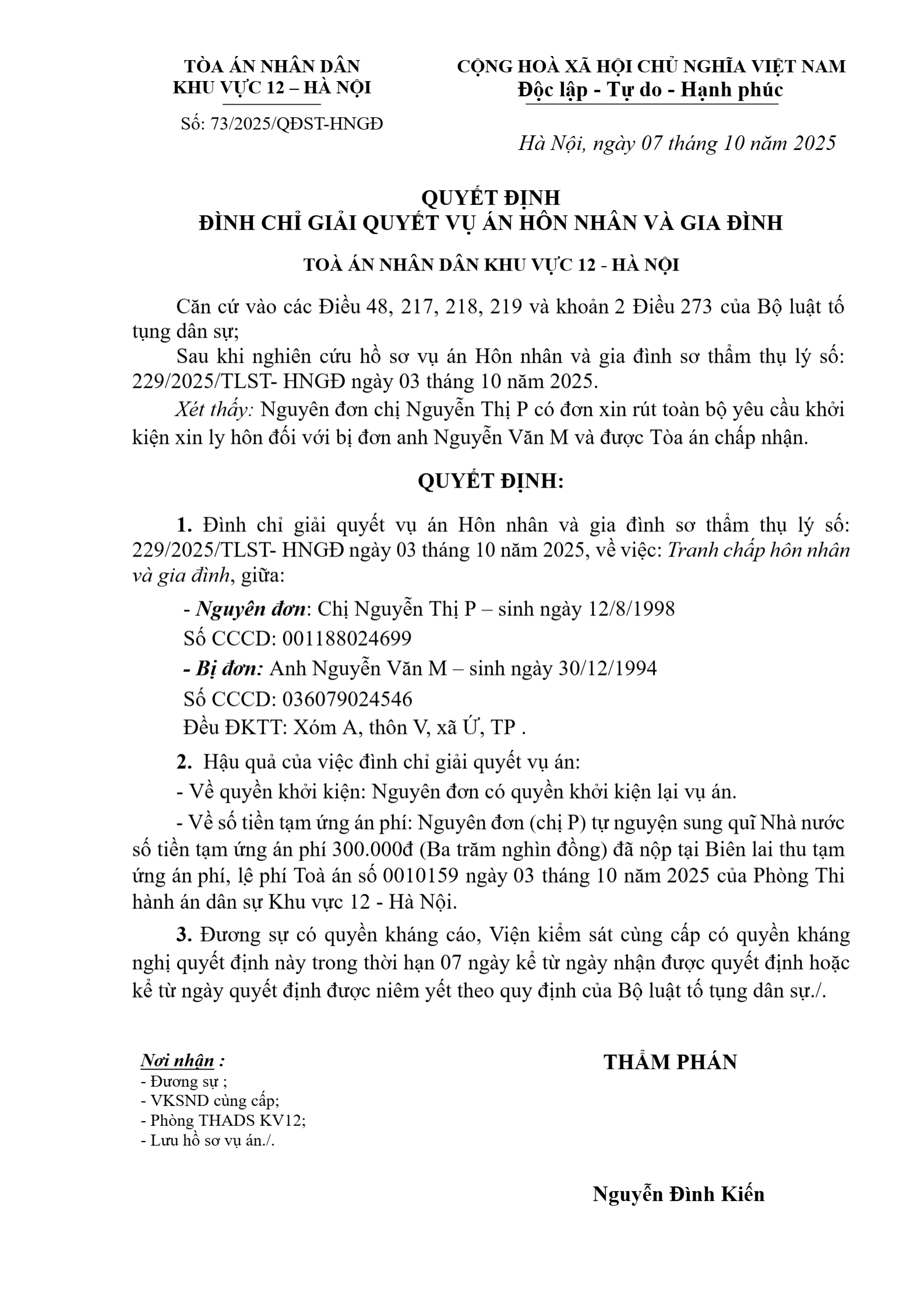 Quyết định số 73/2025/QĐST-HNGĐ