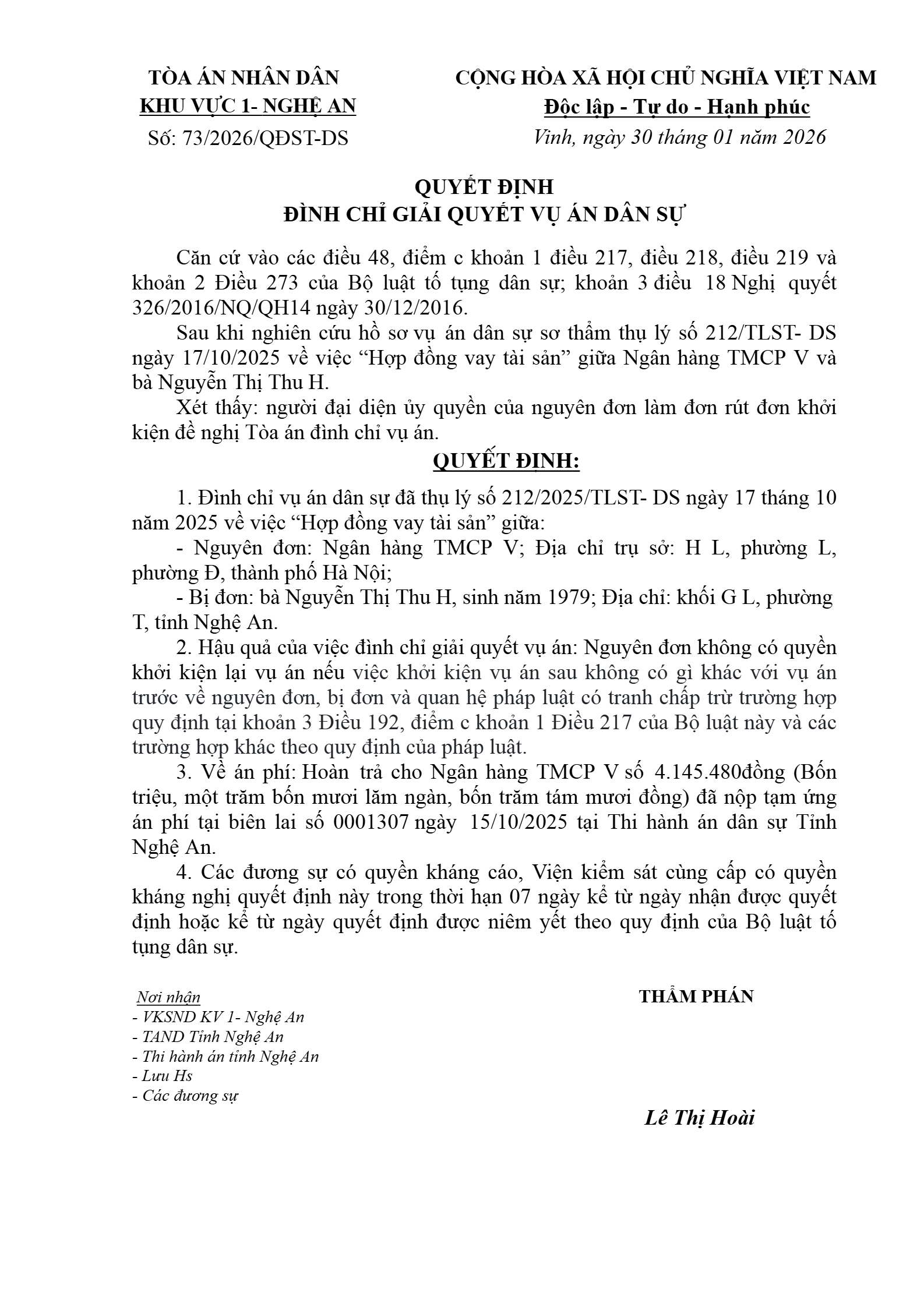 Quyết định số 73/2026/QĐST-DS ngày 30/01/2026 của Tòa án nhân dân khu vực 1 - Nghệ An, tỉnh Nghệ An về tranh chấp hợp đồng tín dụng