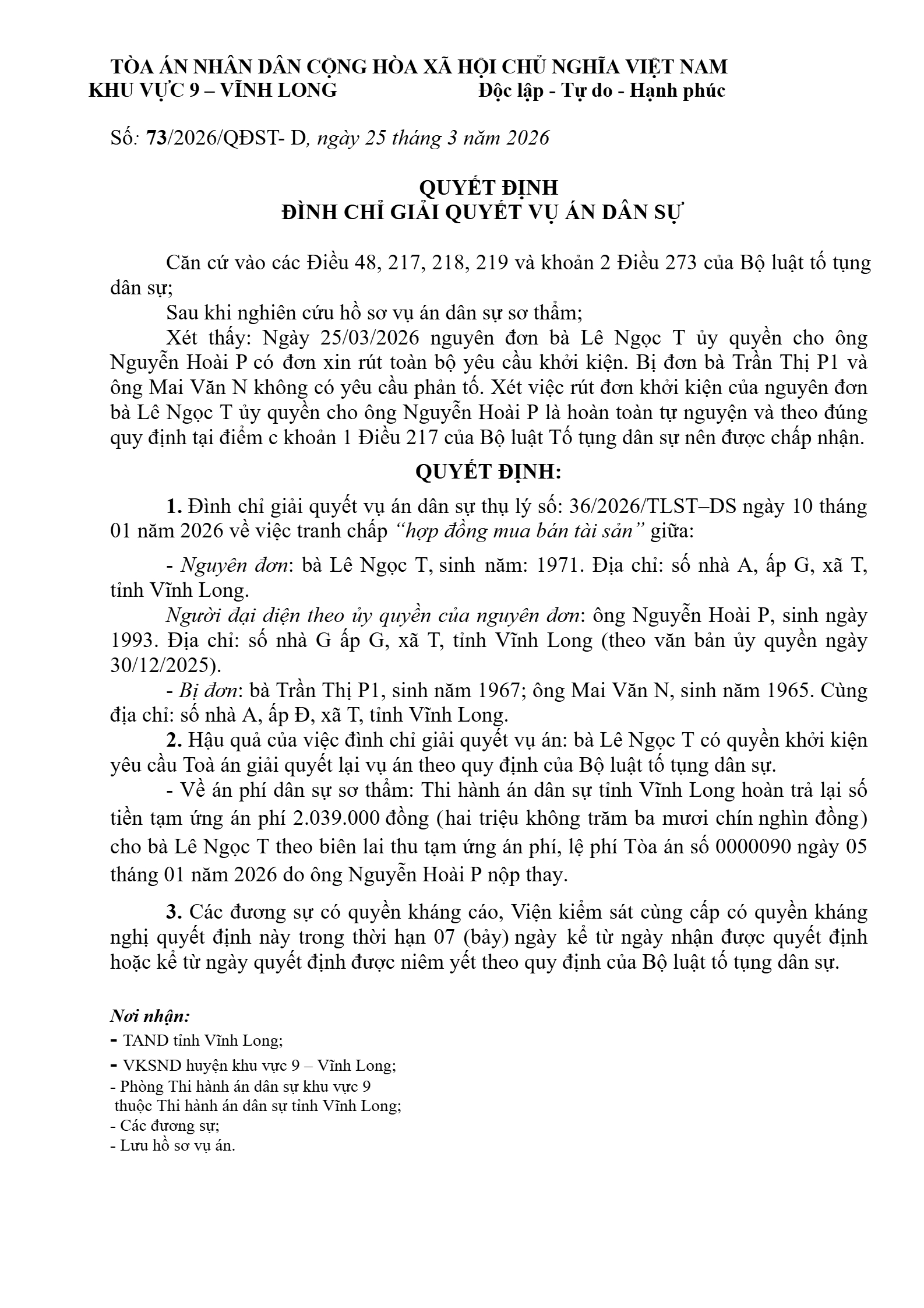 Quyết định số 73/2026/QĐST-DS ngày 25/03/2026 của Tòa án nhân dân khu vực 9 - Vĩnh Long, tỉnh Vĩnh Long về tranh chấp hợp đồng trao đổi tài sản