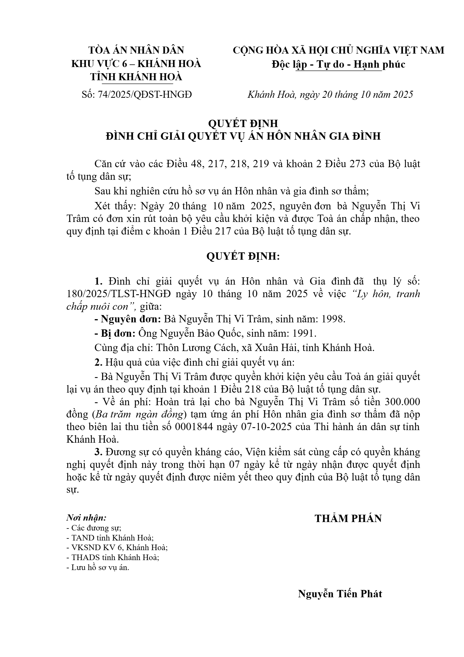 Quyết định số 74/2025/QĐST-HNGĐ ngày 20/10/2025 của Tòa án nhân dân khu vực 6 - Khánh Hòa, tỉnh Khánh Hòa về vụ án ly hôn về mâu thuẫn gia đình