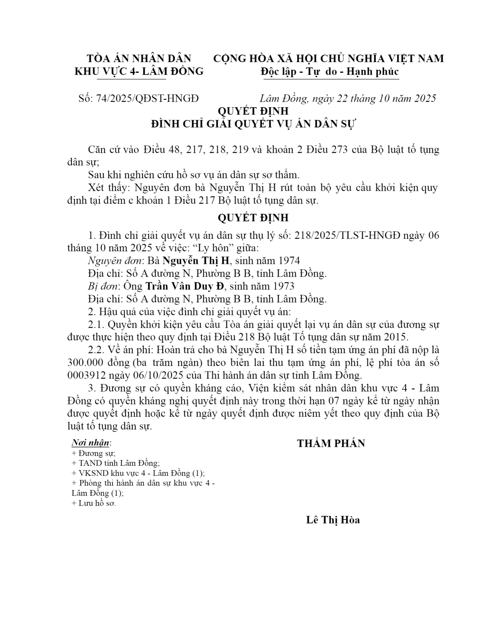 Quyết định số 74/2025/QĐST-HNGĐ ngày 22/10/2025 của Tòa án nhân dân khu vực 4 - Lâm Đồng, tỉnh Lâm Đồng về vụ án ly hôn về mâu thuẫn gia đình