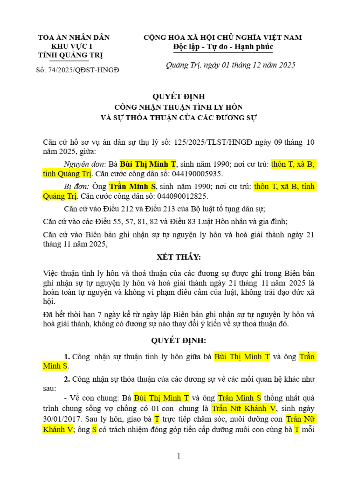 Quyết định số 74/2025/QĐST-HNGĐ ngày 01/12/2025 của Tòa án nhân dân khu vực 1 - Quảng Trị, tỉnh Quảng Trị về vụ án ly hôn về mâu thuẫn gia đình