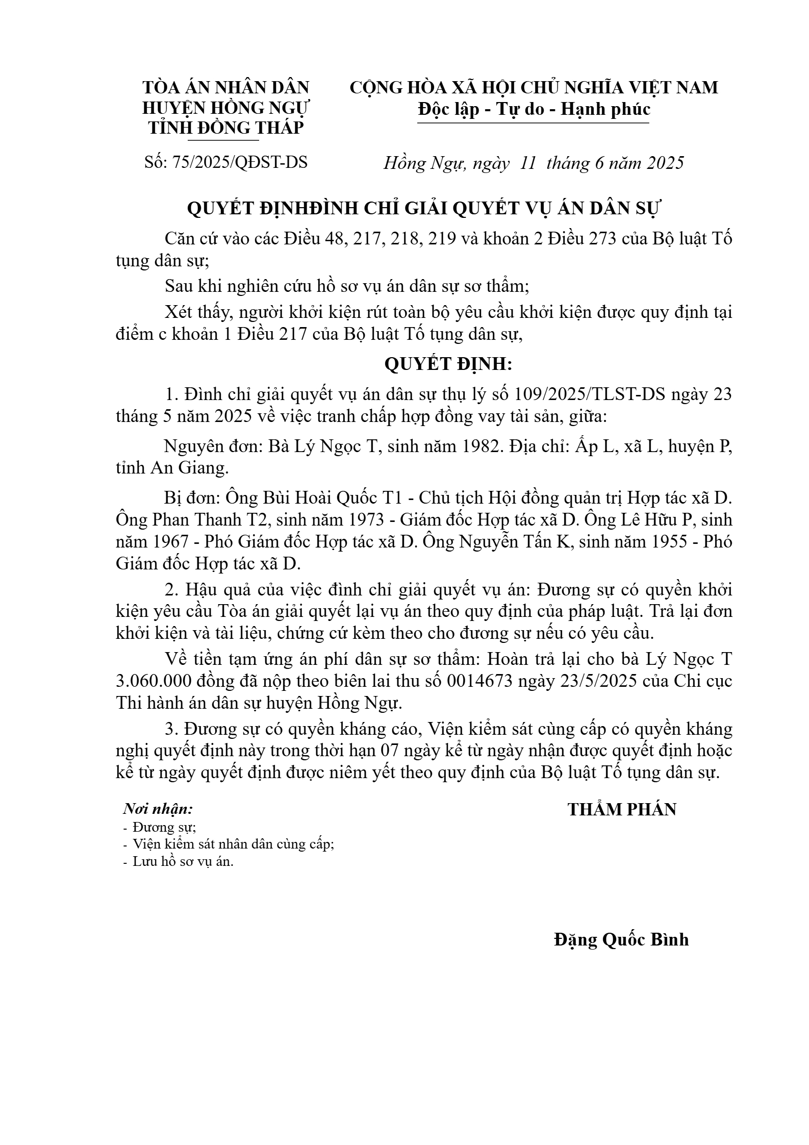 Quyết định số 75/2025/QĐST-DS ngày 11/06/2025 của TAND huyện Hồng Ngự, tỉnh Đồng Tháp về tranh chấp hợp đồng vay tài sản