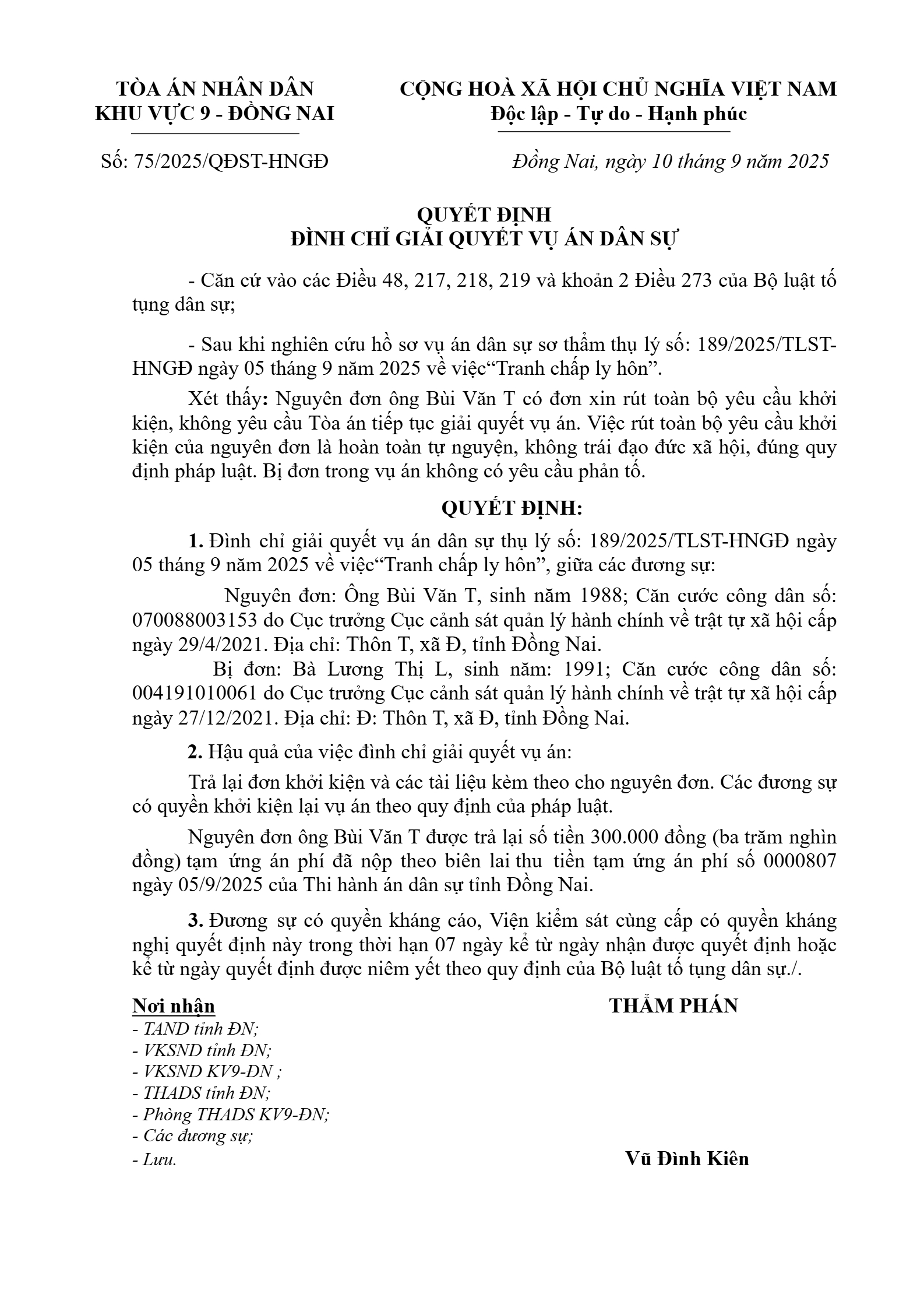 Quyết định số 75/2025/QĐST-HNGĐ ngày 10/09/2025 của Tòa án nhân dân khu vực 9 - Đồng Nai, tỉnh Đồng Nai về vụ án ly hôn về mâu thuẫn gia đình