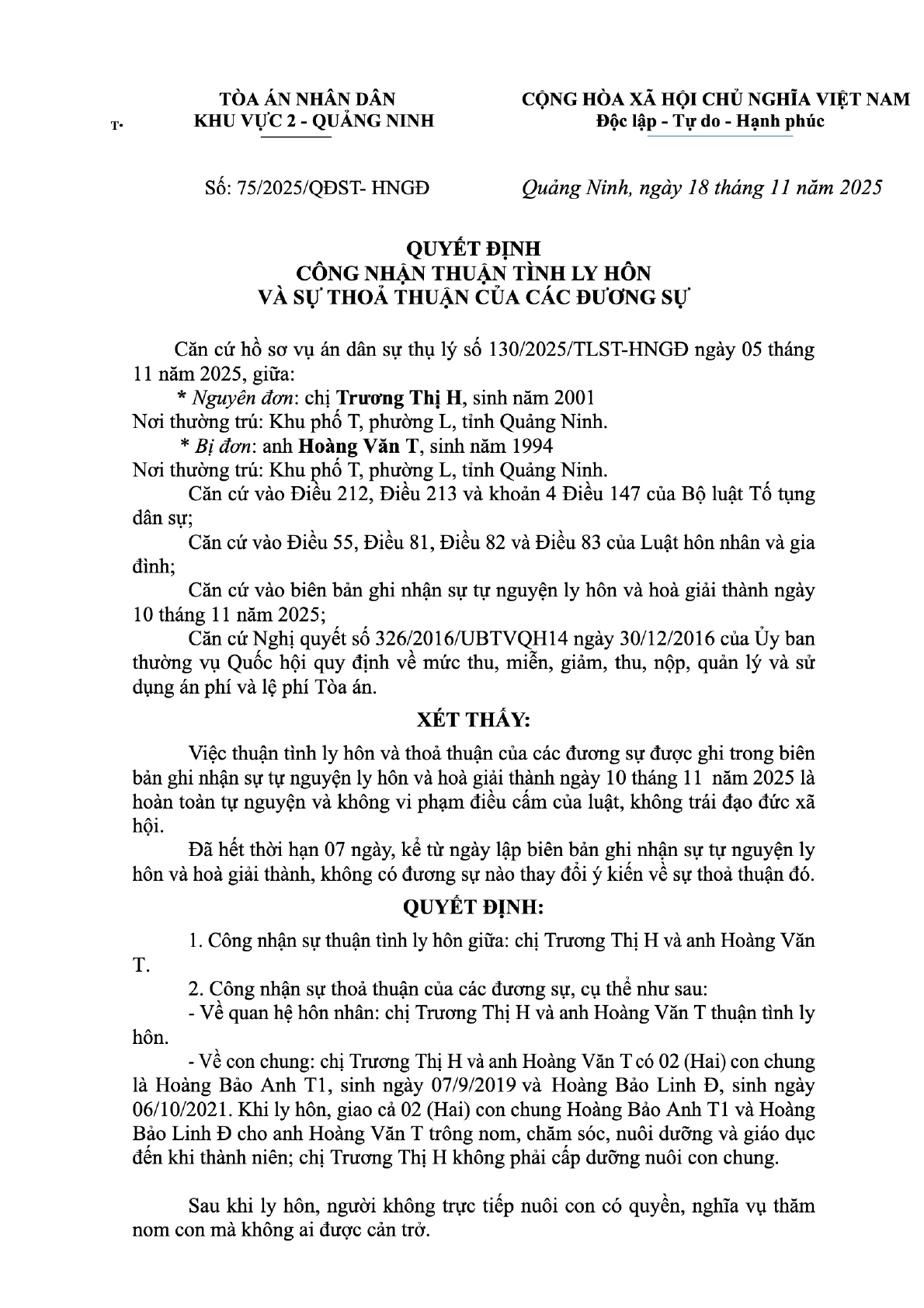 Quyết định số 75/2025/QĐST-HNGĐ ngày 18/11/2025 của Tòa án nhân dân khu vực 2 - Quảng Ninh, tỉnh Quảng Ninh về vụ án ly hôn về mâu thuẫn gia đình
