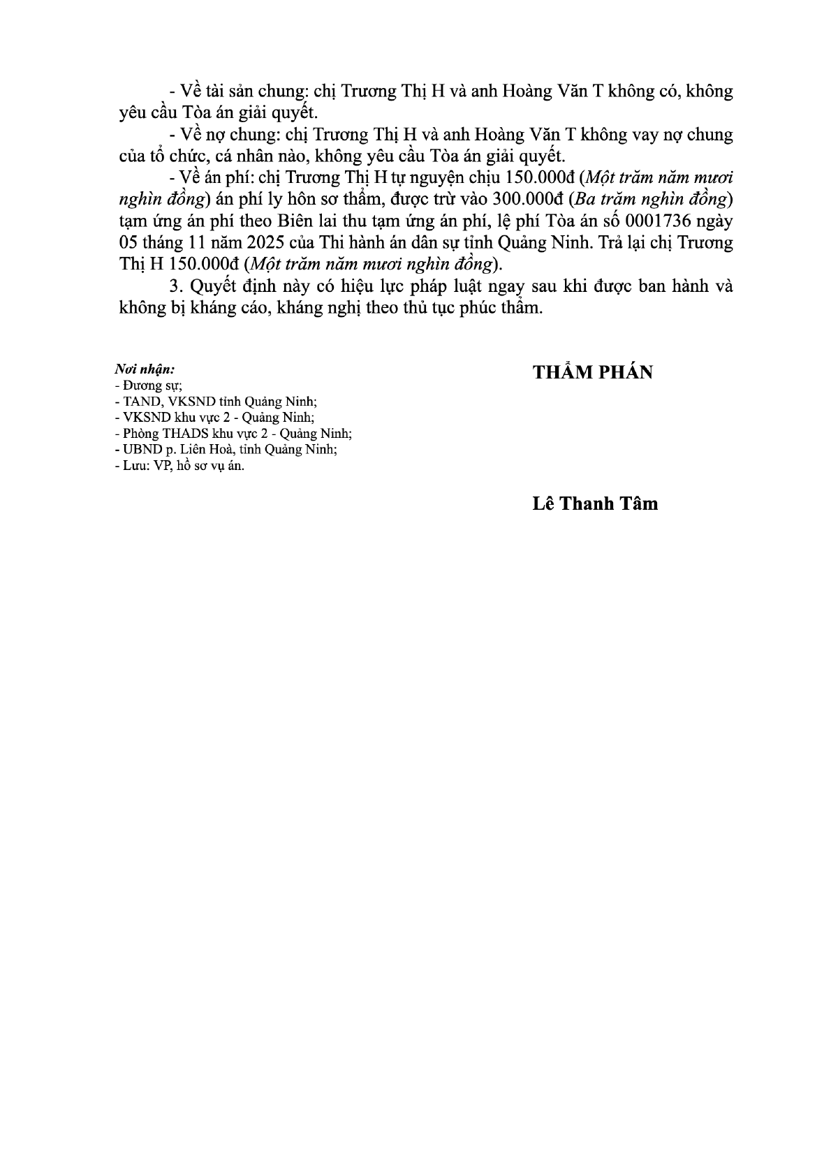 | Thông tin về vụ/việc: | Chị Trương Thị H xin ly hôn anh Hoàng Văn T |