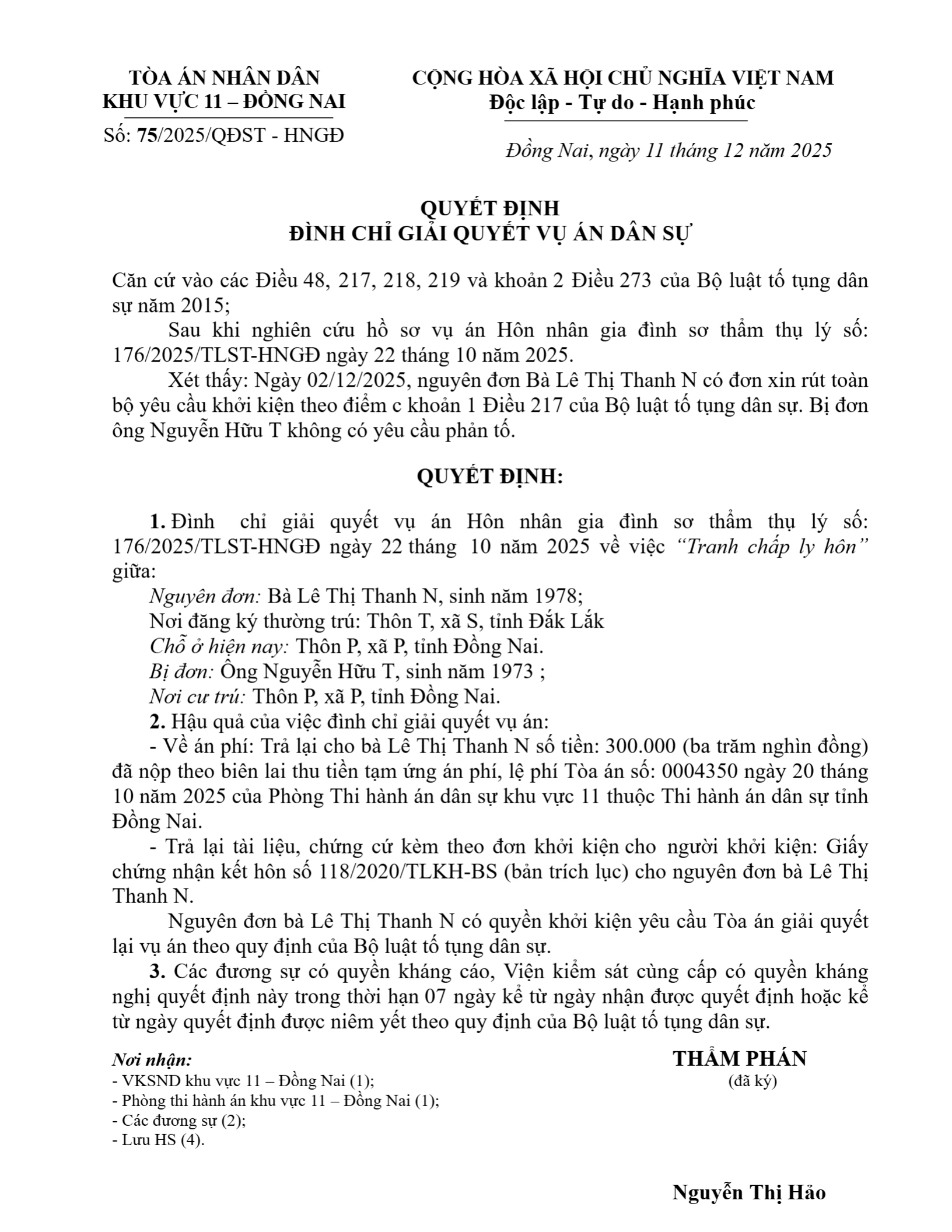 Quyết định số 75/2025/QĐST-HNGĐ ngày 11/12/2025 của Tòa án nhân dân khu vực 11 - Đồng Nai, tỉnh Đồng Nai về vụ án ly hôn về mâu thuẫn gia đình