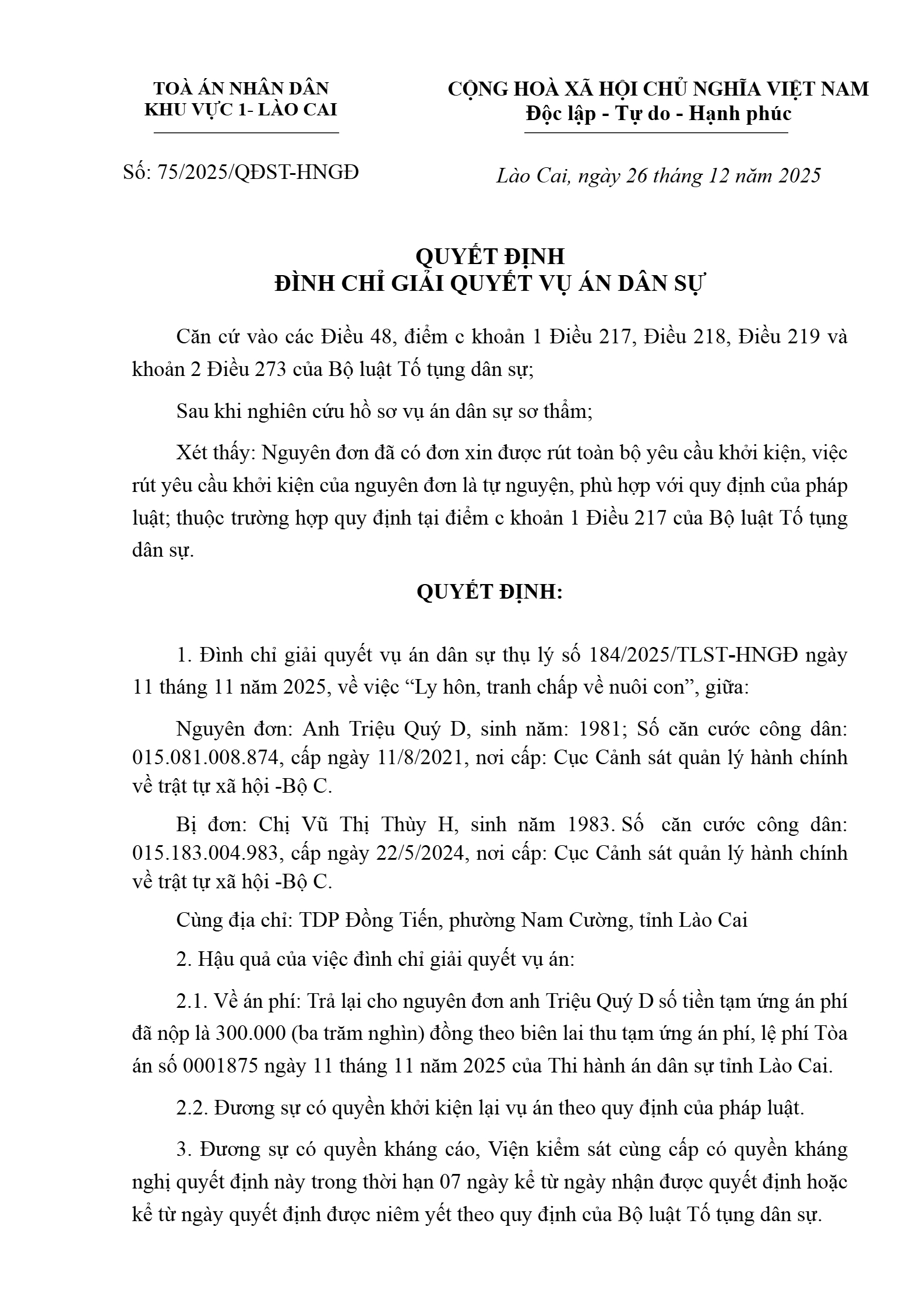 Quyết định số 75/2025/QĐST-HNGĐ ngày 26/12/2025 của Tòa án nhân dân khu vực 1 - Lào Cai, tỉnh Lào Cai về vụ án ly hôn về mâu thuẫn gia đình