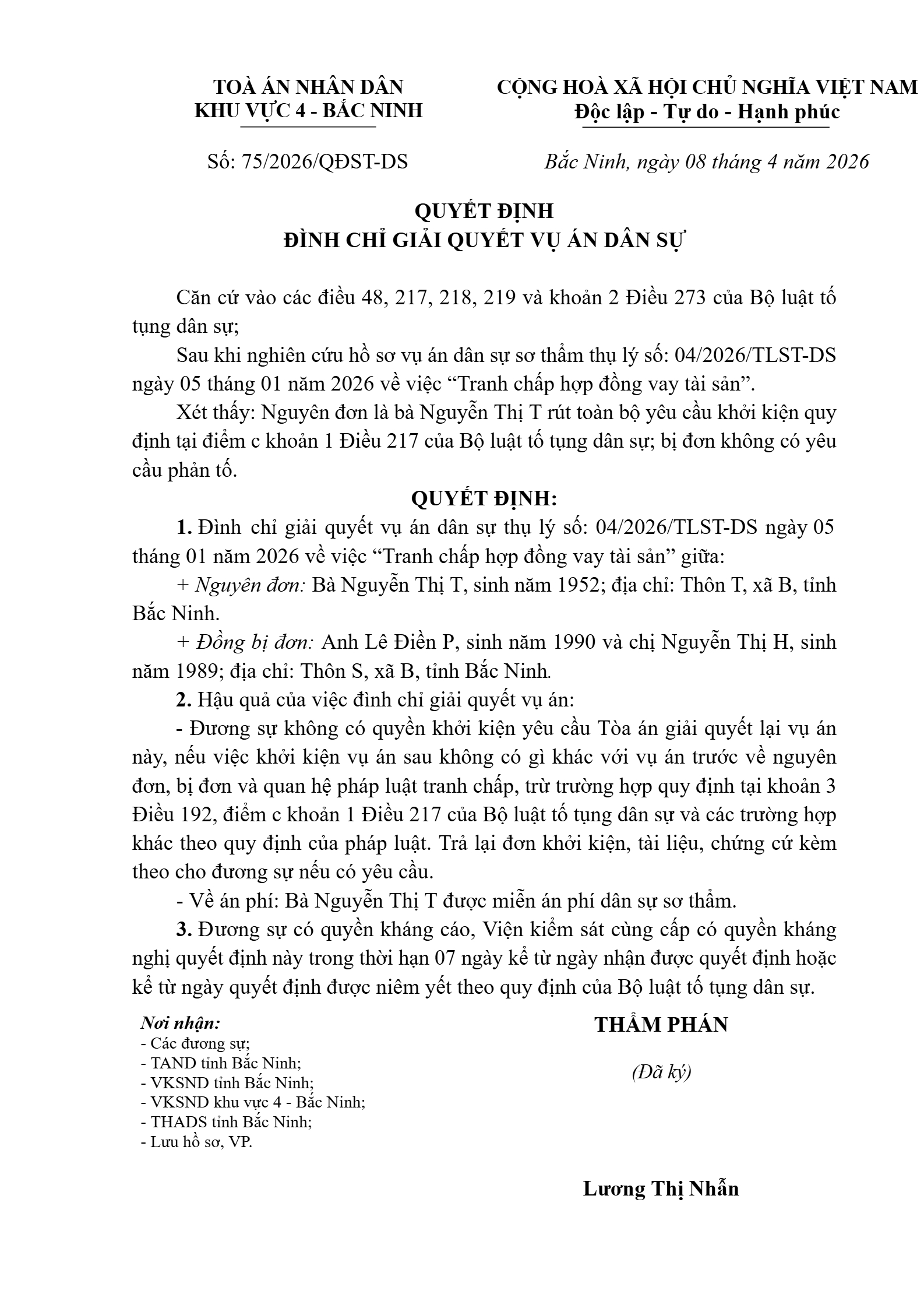 Quyết định số 75/2026/QĐST-DS ngày 08/04/2026 của Tòa án nhân dân khu vực 4 - Bắc Ninh, tỉnh Bắc Ninh về tranh chấp hợp đồng vay tài sản