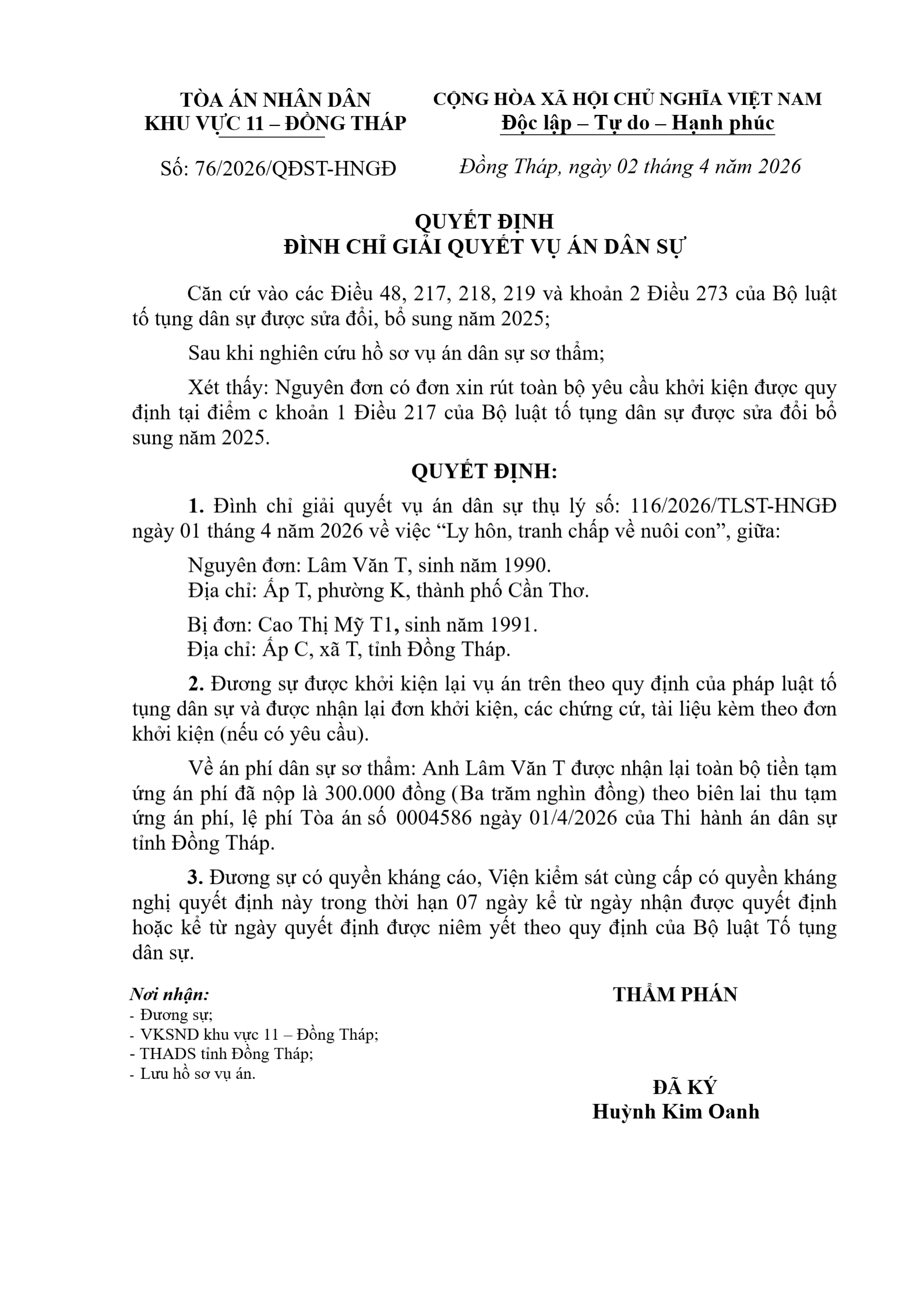 Quyết định số 76/2026/QĐST-HNGĐ ngày 02/04/2026 của Tòa án nhân dân khu vực 11 - Đồng Tháp, tỉnh Đồng Tháp về vụ án ly hôn về mâu thuẫn gia đình