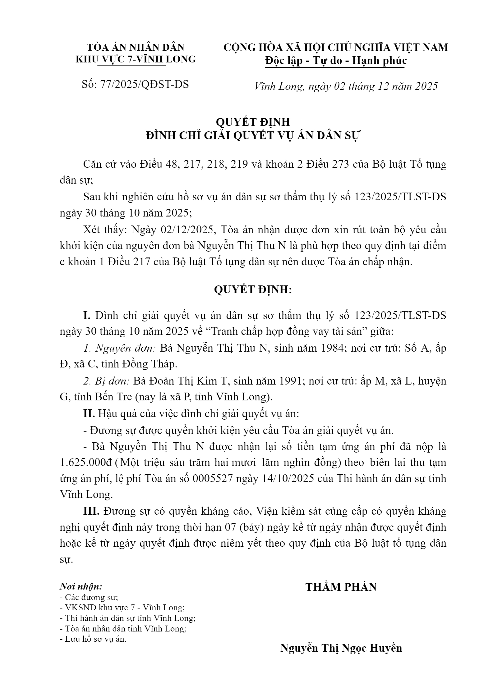 Quyết định số 77/2025/QĐST-DS ngày 02/12/2025 của Tòa án nhân dân khu vực 7 - Vĩnh Long, tỉnh Vĩnh Long về tranh chấp hợp đồng vay tài sản