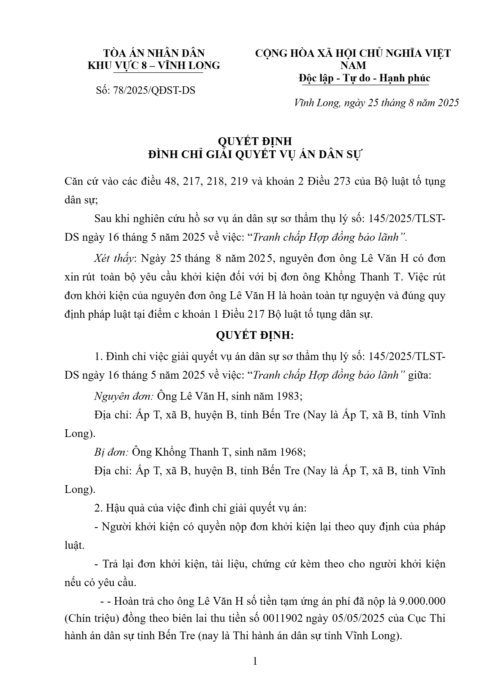 Quyết định số 78/2025/QĐST-DS ngày 25/08/2025 của Tòa án nhân dân khu vực 8 - Vĩnh Long, tỉnh Vĩnh Long về tranh chấp hợp đồng bảo hiểm