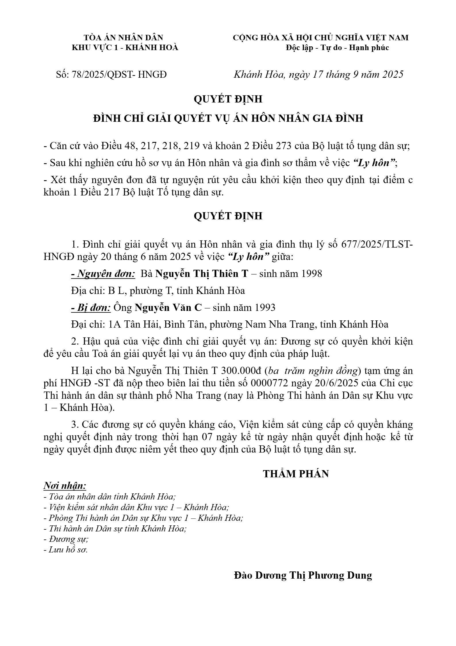 Quyết định số 78/2025/QĐST-HNGĐ ngày 17/09/2025 của Tòa án nhân dân khu vực 1 - Khánh Hòa, tỉnh Khánh Hòa về vụ án ly hôn về mâu thuẫn gia đình