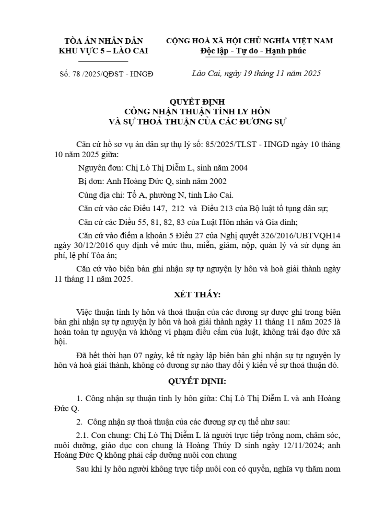 Quyết định số 78/2025/QĐST-HNGĐ ngày 19/11/2025 của Tòa án nhân dân khu vực 5 - Lào Cai, tỉnh Lào Cai về vụ án ly hôn về mâu thuẫn gia đình