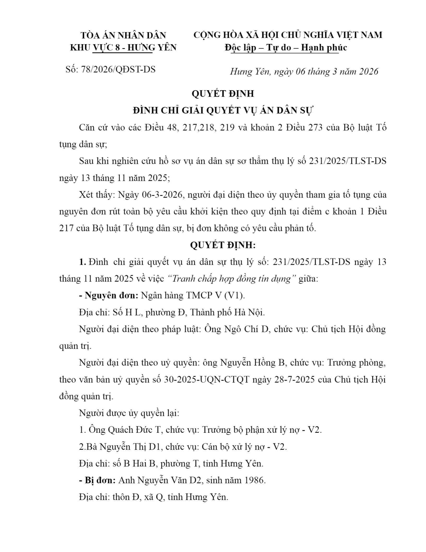 Quyết định số 78/2026/QĐST-DS ngày 06/03/2026 của Tòa án nhân dân khu vực 8 - Hưng Yên, tỉnh Hưng Yên về tranh chấp hợp đồng tín dụng