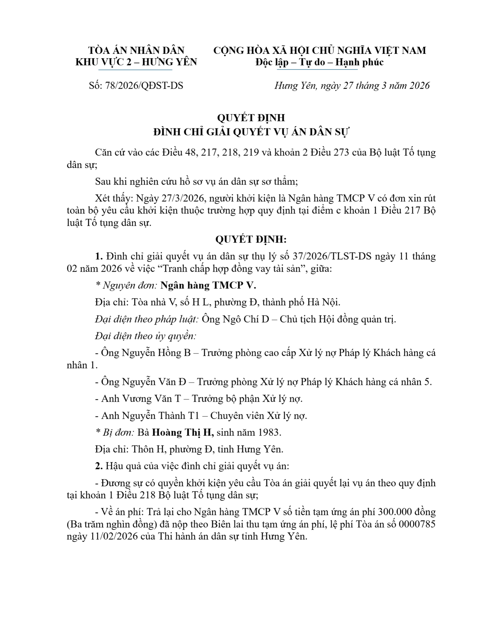 Quyết định số 78/2026/QĐST-DS ngày 27/03/2026 của Tòa án nhân dân khu vực 2 - Hưng Yên, tỉnh Hưng Yên về tranh chấp hợp đồng tín dụng