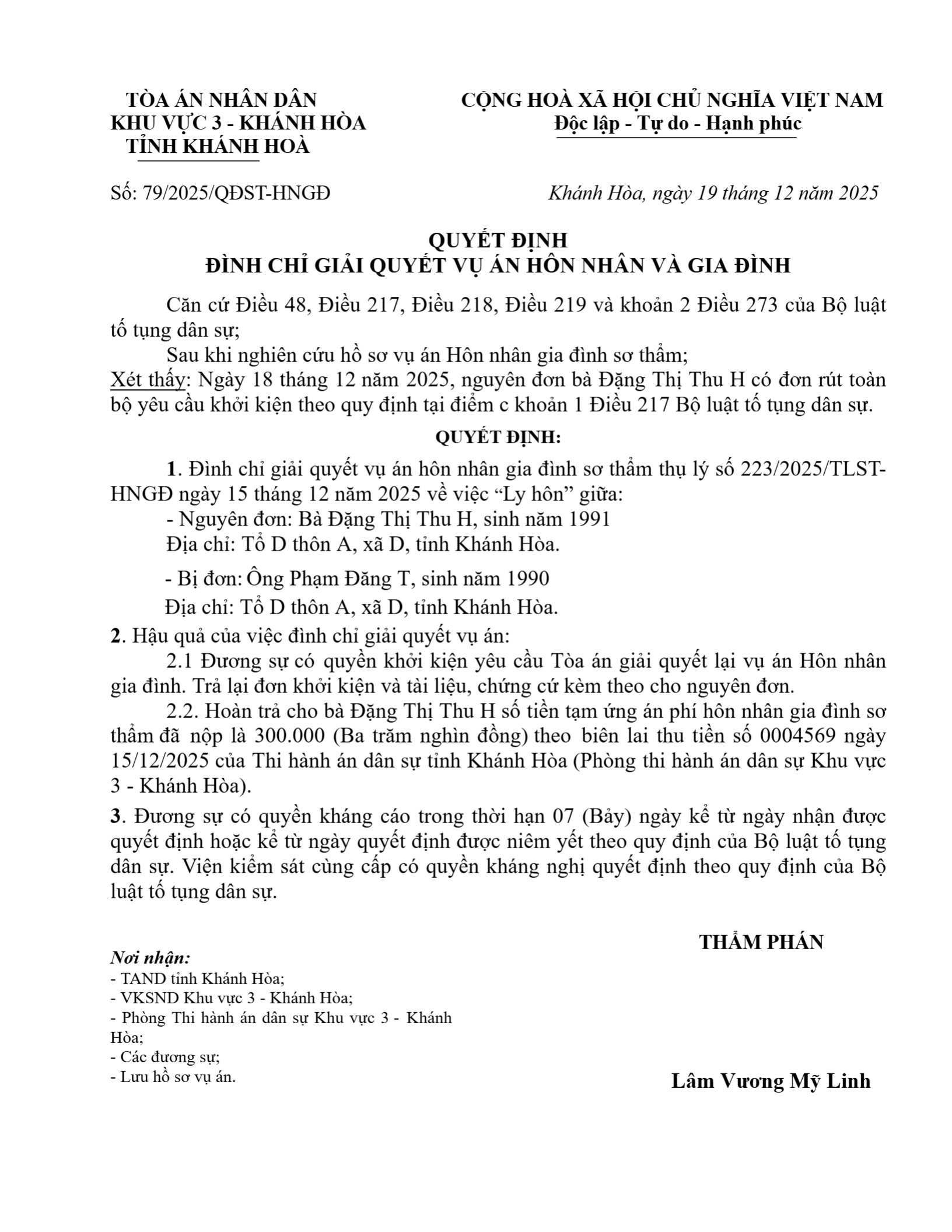 Quyết định số 79/2025/QĐST-HNGĐ ngày 04/03/2026 của Tòa án nhân dân khu vực 3 - Khánh Hòa, tỉnh Khánh Hòa về vụ án ly hôn về mâu thuẫn gia đình