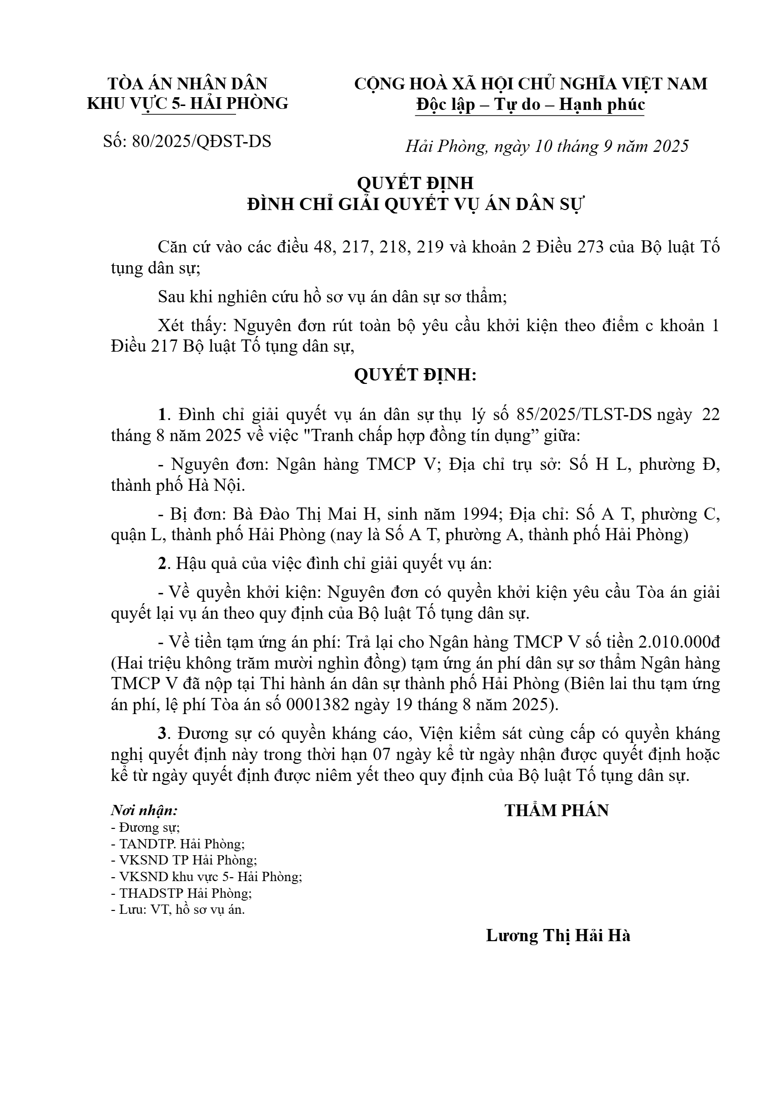 Quyết định số 80/2025/QĐST-DS ngày 10/09/2025 của Tòa án nhân dân khu vực 5 - Hải Phòng, TP. Hải Phòng về tranh chấp hợp đồng tín dụng