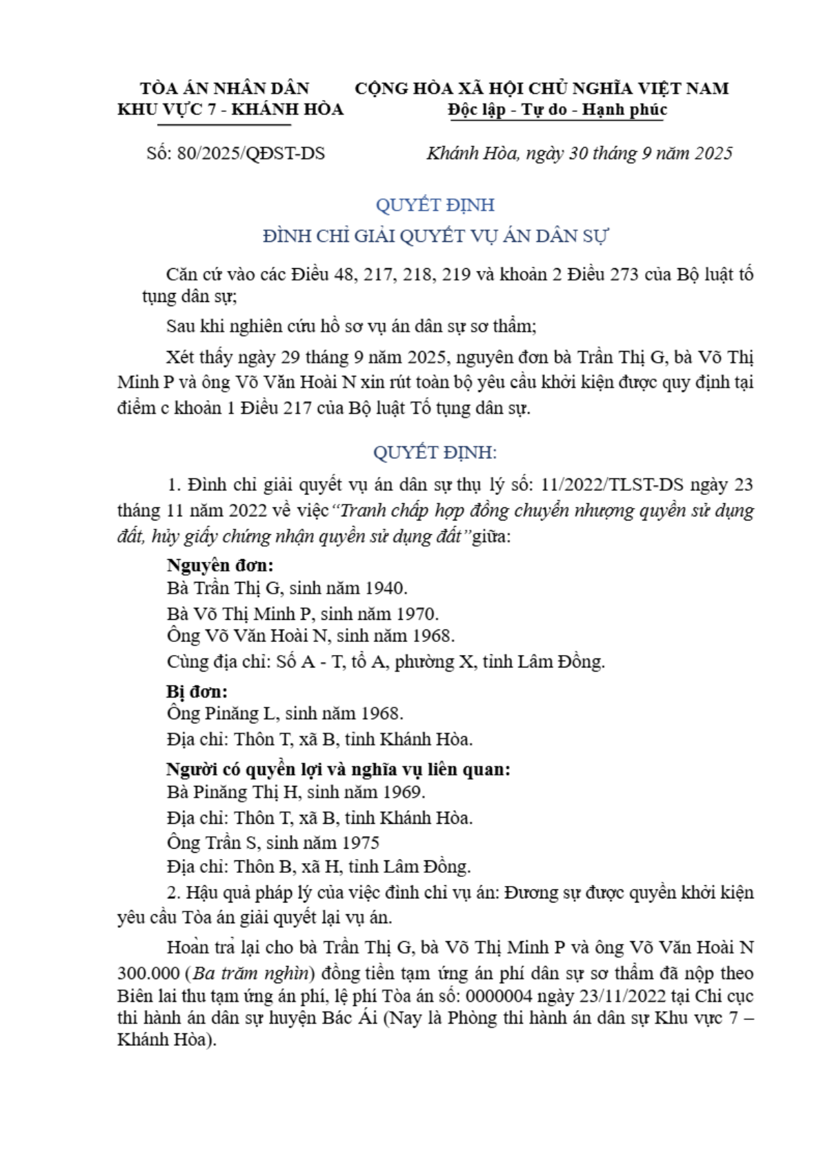 Quyết định số 80/2025/QĐST-DS ngày 30/09/2025 của Tòa án nhân dân khu vực 7 - Khánh Hòa, tỉnh Khánh Hòa về tranh chấp hợp đồng chuyển nhượng quyền sử dụng đất