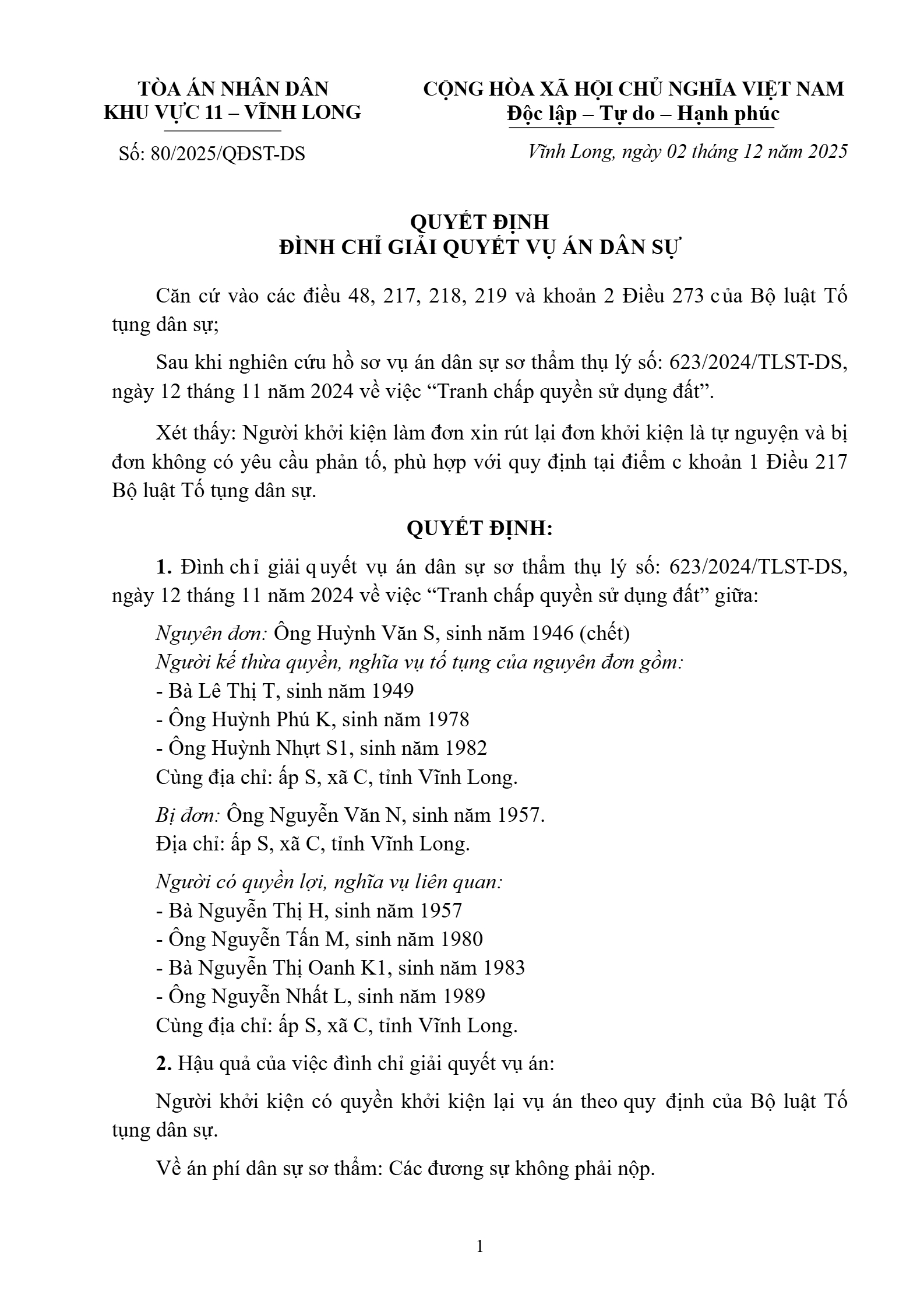 Quyết định số 80/2025/QĐST-DS ngày 02/12/2025 của Tòa án nhân dân khu vực 11 - Vĩnh Long, tỉnh Vĩnh Long về tranh chấp đất đai
