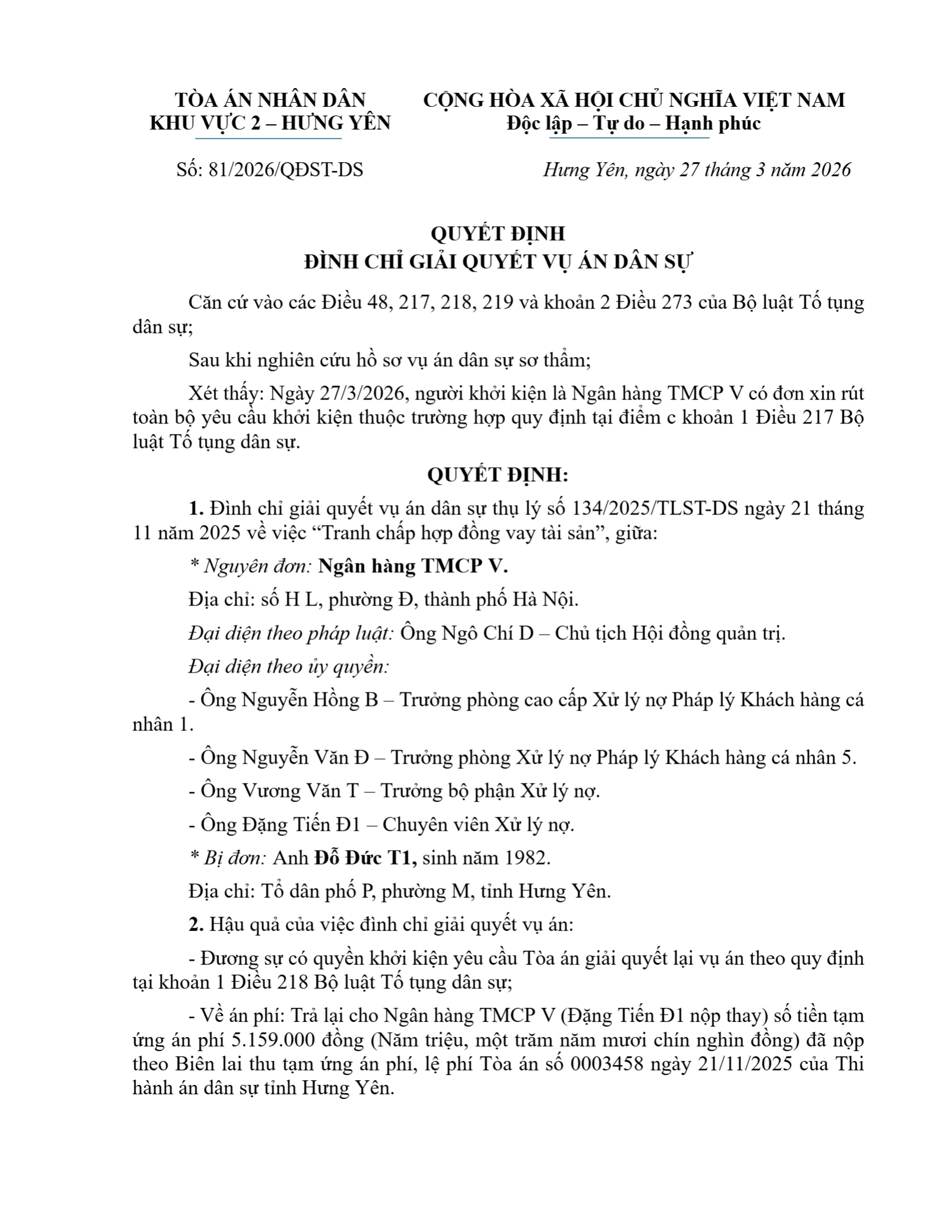 Quyết định số 81/2026/QĐST-DS ngày 27/03/2026 của Tòa án nhân dân khu vực 2 - Hưng Yên, tỉnh Hưng Yên về tranh chấp hợp đồng vay tài sản