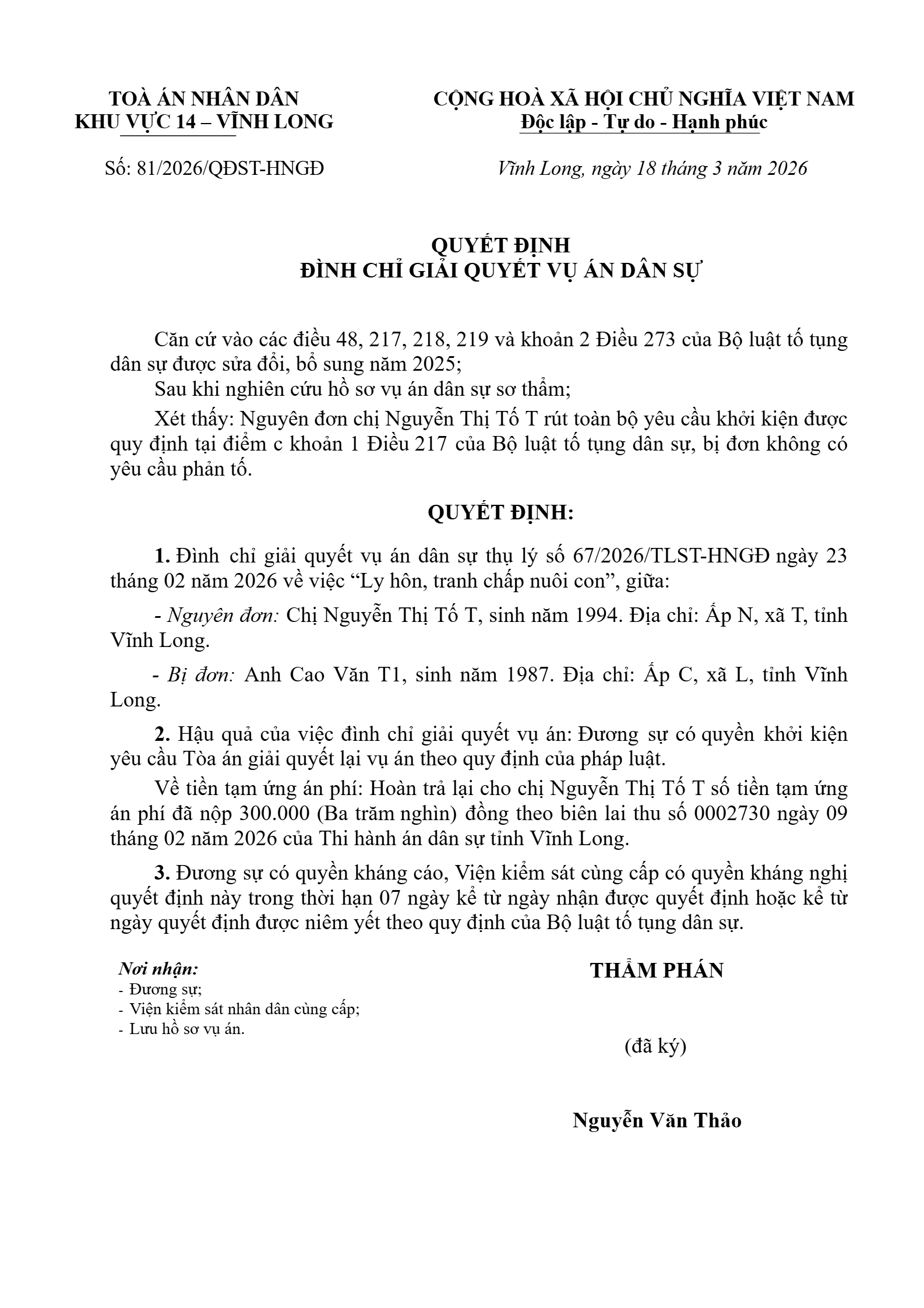 Quyết định số 81/2026/QĐST-HNGĐ ngày 18/03/2026 của Tòa án nhân dân khu vực 14 - Vĩnh Long, tỉnh Vĩnh Long về vụ án ly hôn về mâu thuẫn gia đình