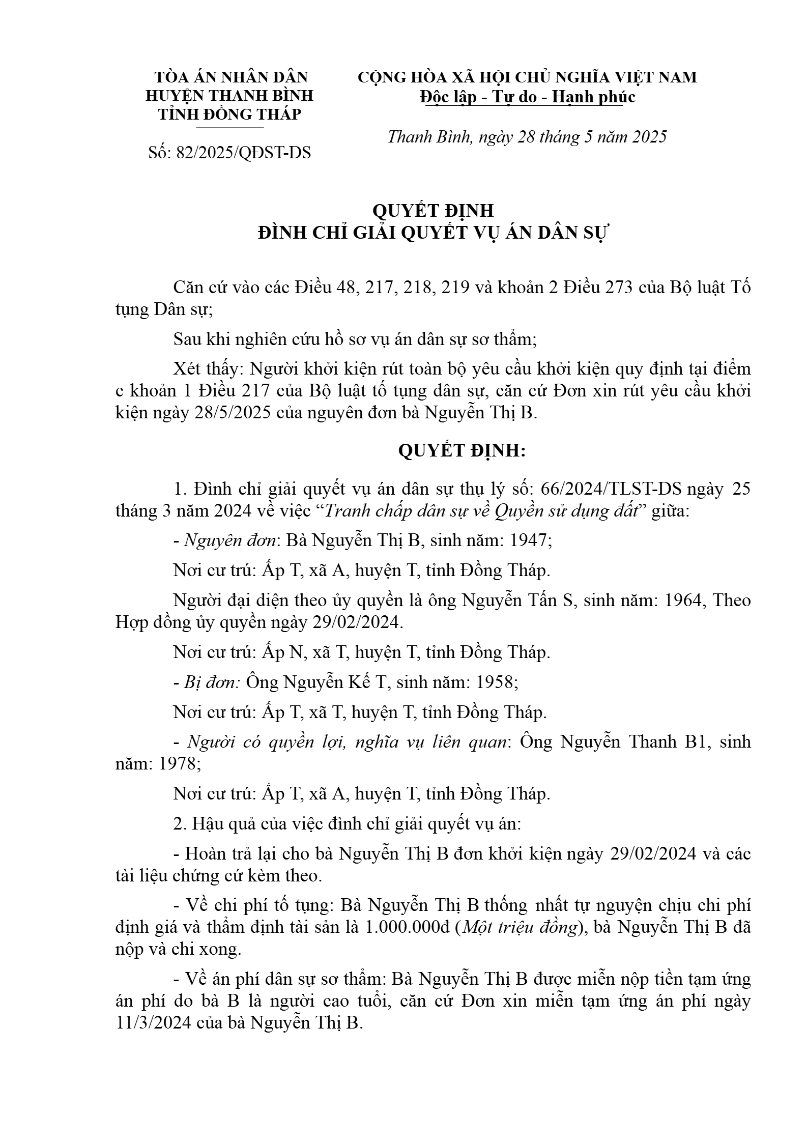 Quyết định số 82/2025/QĐST-DS ngày 28/05/2025 của TAND huyện Thanh Bình, tỉnh Đồng Tháp về tranh chấp quyền sử dụng đất