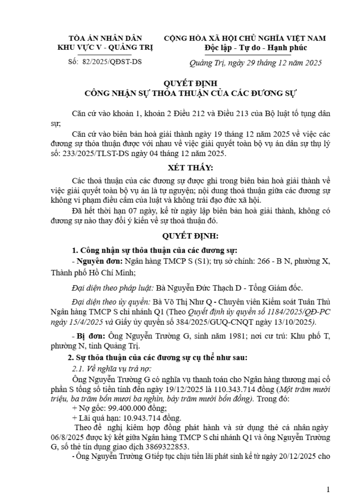 Quyết định số 82/2025/QĐST-DS ngày 29/12/2025 của Tòa án nhân dân khu vực 5 - Quảng Trị, tỉnh Quảng Trị về tranh chấp hợp đồng tín dụng