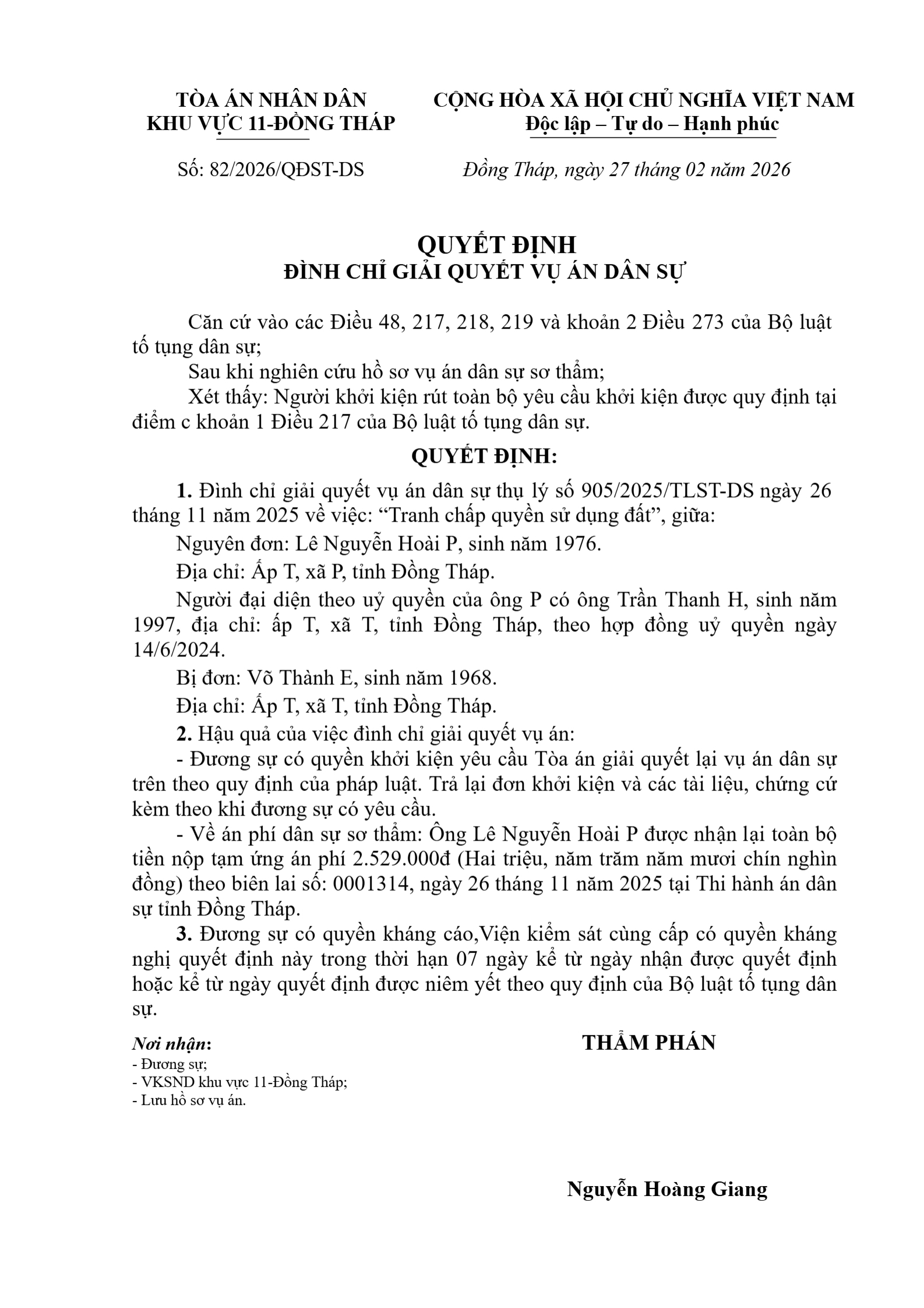 Quyết định số 82/2026/QĐST-DS ngày 27/02/2026 của Tòa án nhân dân khu vực 11 - Đồng Tháp, tỉnh Đồng Tháp về tranh chấp quyền sử dụng đất