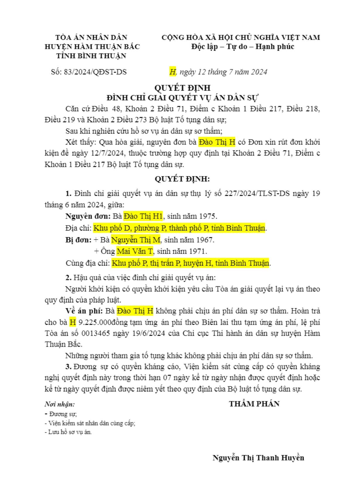 Quyết định số 83/2024/QĐST-DS ngày 30/09/2024 của TAND huyện Hàm Thuận Bắc, tỉnh Bình Thuận về tranh chấp về hụi, họ, biêu, phường