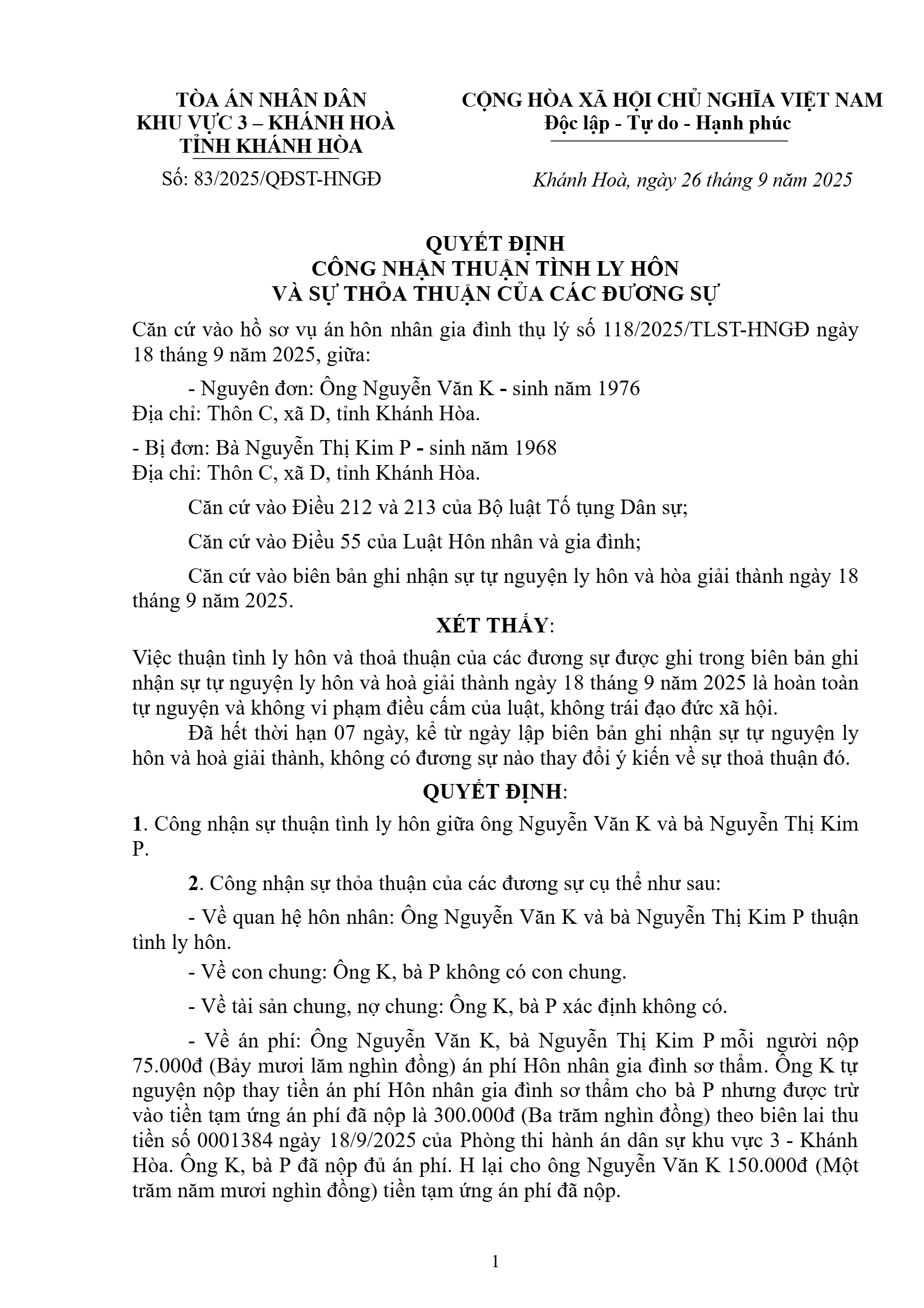 Quyết định số 83/2025/QĐST-HNGĐ ngày 26/09/2025 của Tòa án nhân dân khu vực 3 - Khánh Hòa, tỉnh Khánh Hòa về vụ án ly hôn về mâu thuẫn gia đình