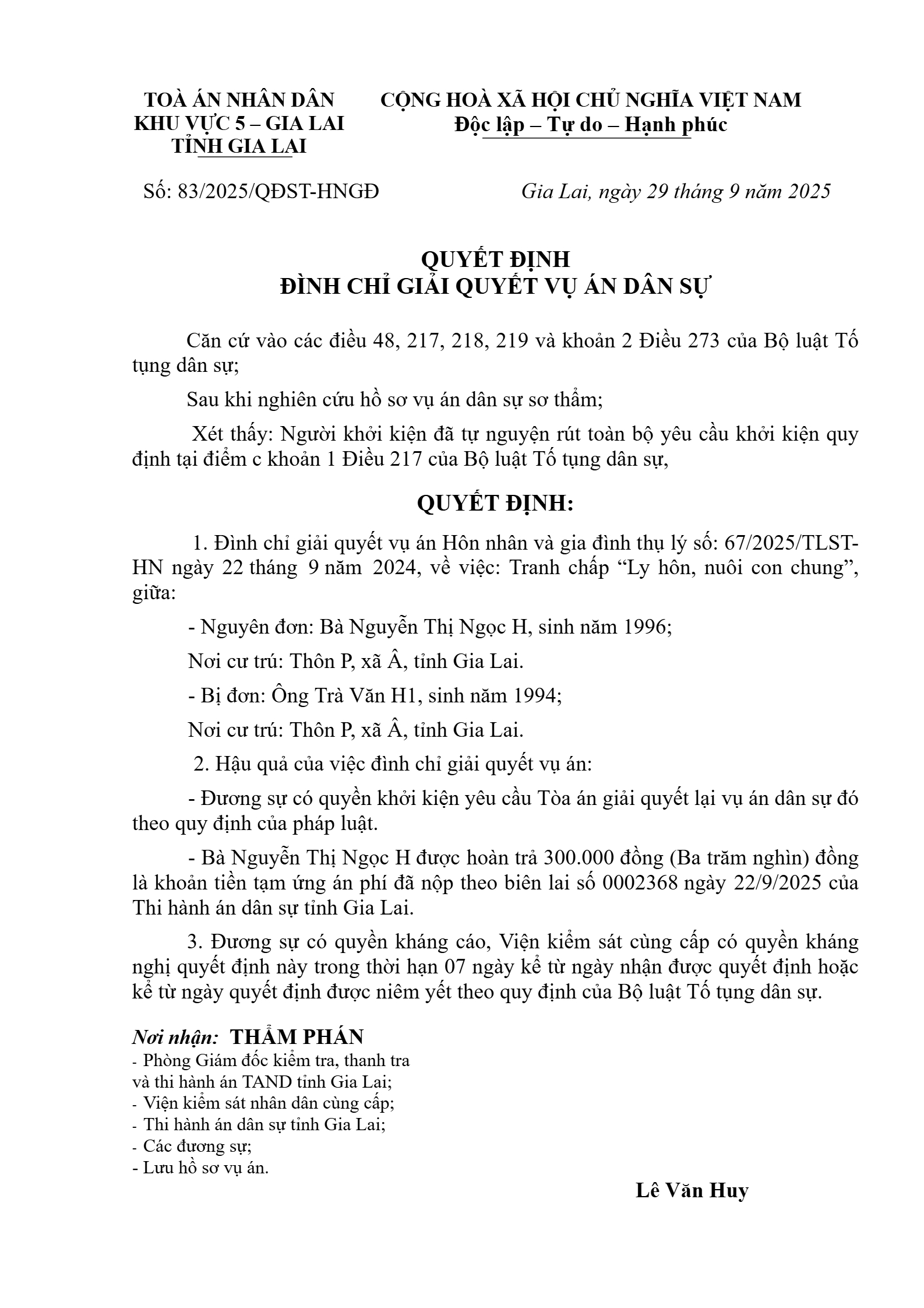 | Thông tin về vụ/việc: | QUYẾT ĐỊNH ĐÌNH CHỈ GIẢI QUYẾT VỤ ÁN DÂN SỰ |