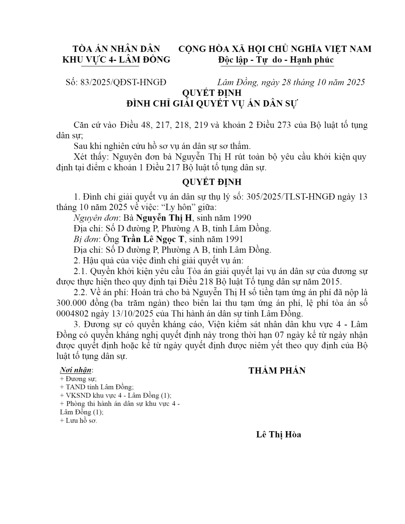 Quyết định số 83/2025/QĐST-HNGĐ ngày 28/10/2025 của Tòa án nhân dân khu vực 4 - Lâm Đồng, tỉnh Lâm Đồng về vụ án ly hôn về mâu thuẫn gia đình