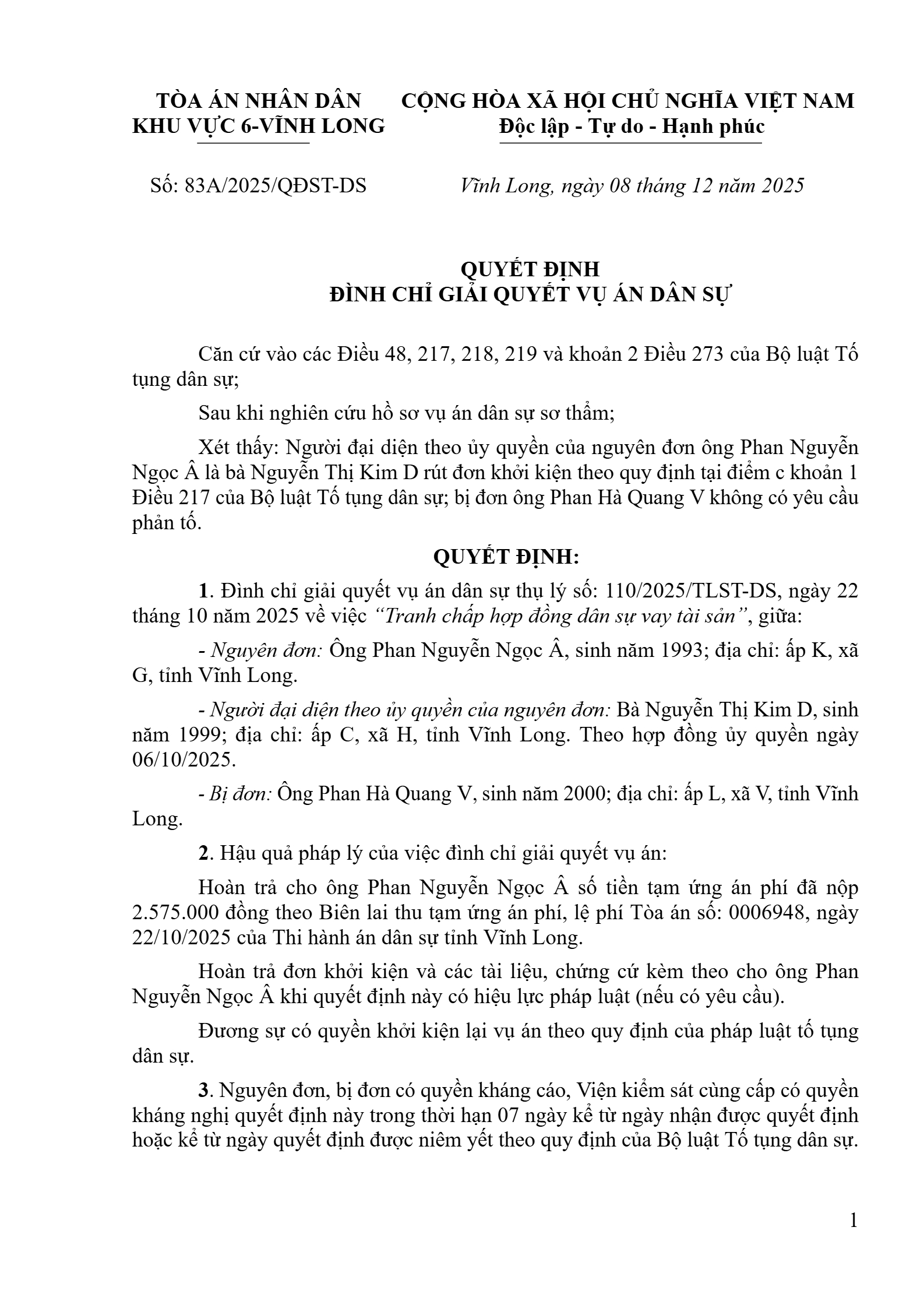 Quyết định số 83A/2025/QĐST-DS ngày 08/12/2025 của Tòa án nhân dân khu vực 6 - Vĩnh Long, tỉnh Vĩnh Long về tranh chấp hợp đồng vay tài sản