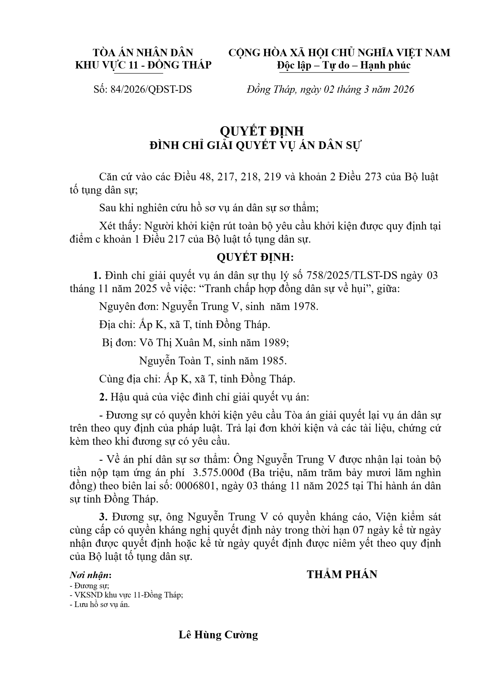 Quyết định số 84/2026/QĐST-DS ngày 02/03/2026 của Tòa án nhân dân khu vực 11 - Đồng Tháp, tỉnh Đồng Tháp về tranh chấp về hụi, họ, biêu, phường
