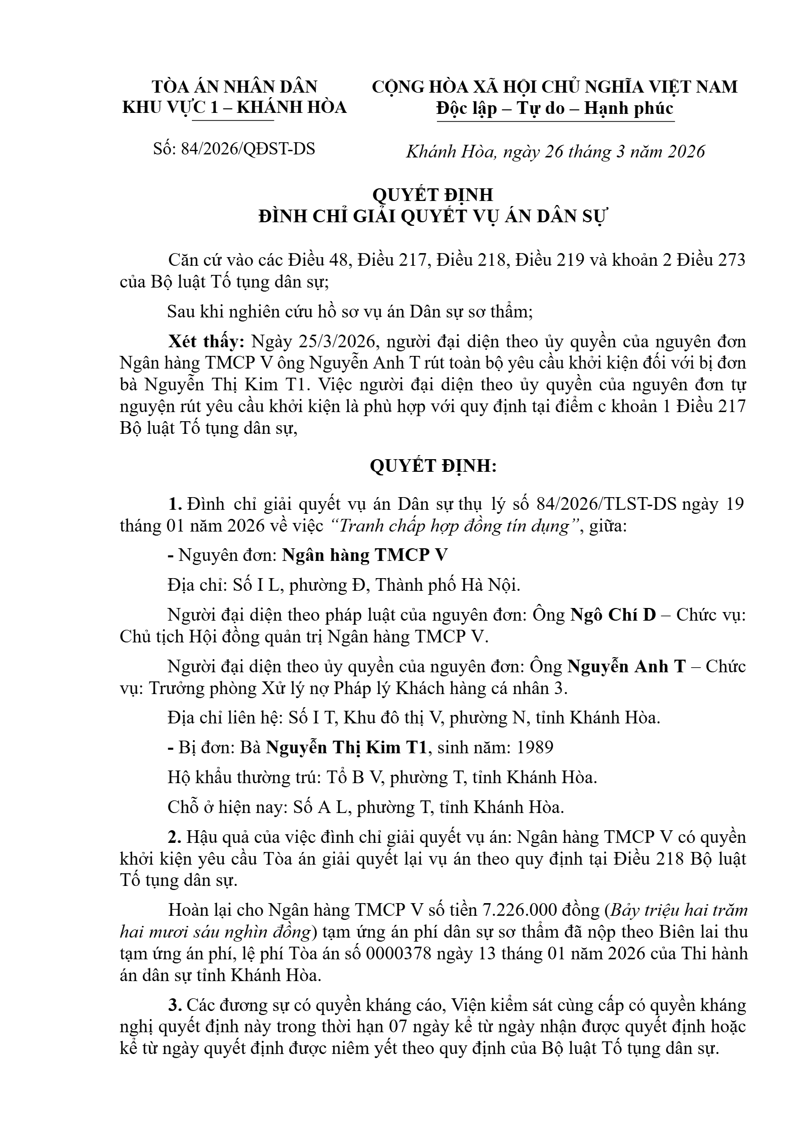 Quyết định số 84/2026/QĐST-DS ngày 26/03/2026 của Tòa án nhân dân khu vực 1 - Khánh Hòa, tỉnh Khánh Hòa về tranh chấp hợp đồng tín dụng
