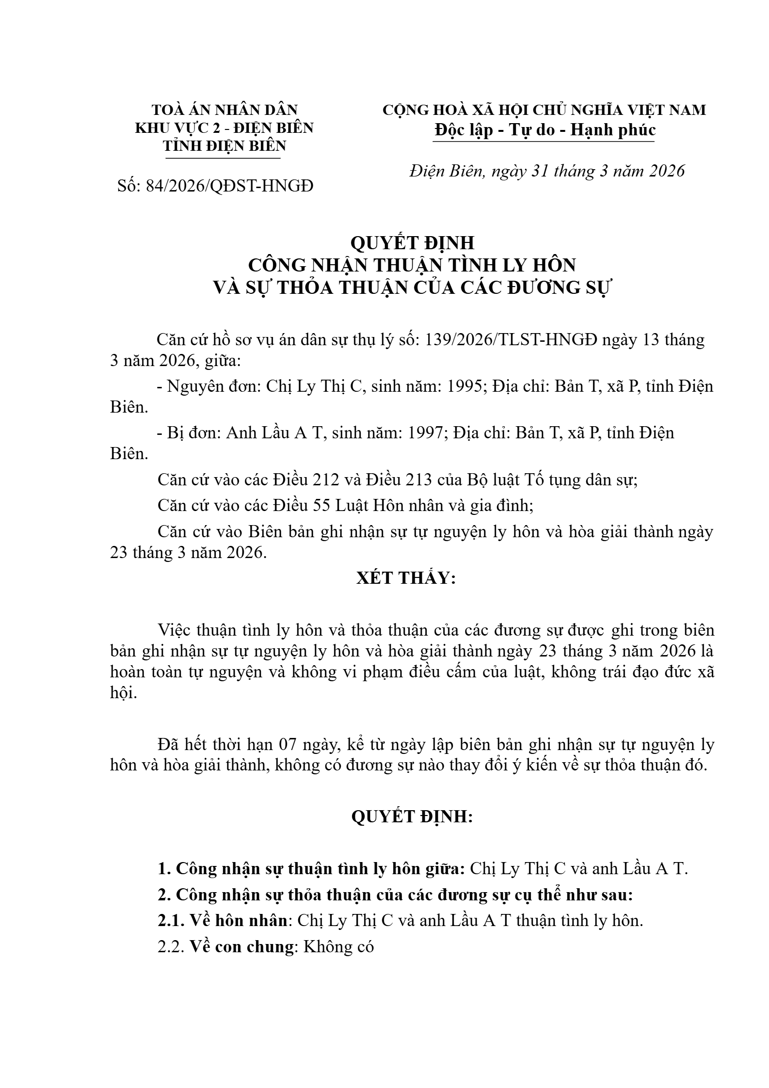 Quyết định số 84/2026/QĐST-HNGĐ ngày 31/03/2026 của Tòa án nhân dân khu vực 2 - Điện Biên, tỉnh Điện Biên về vụ án ly hôn về mâu thuẫn gia đình