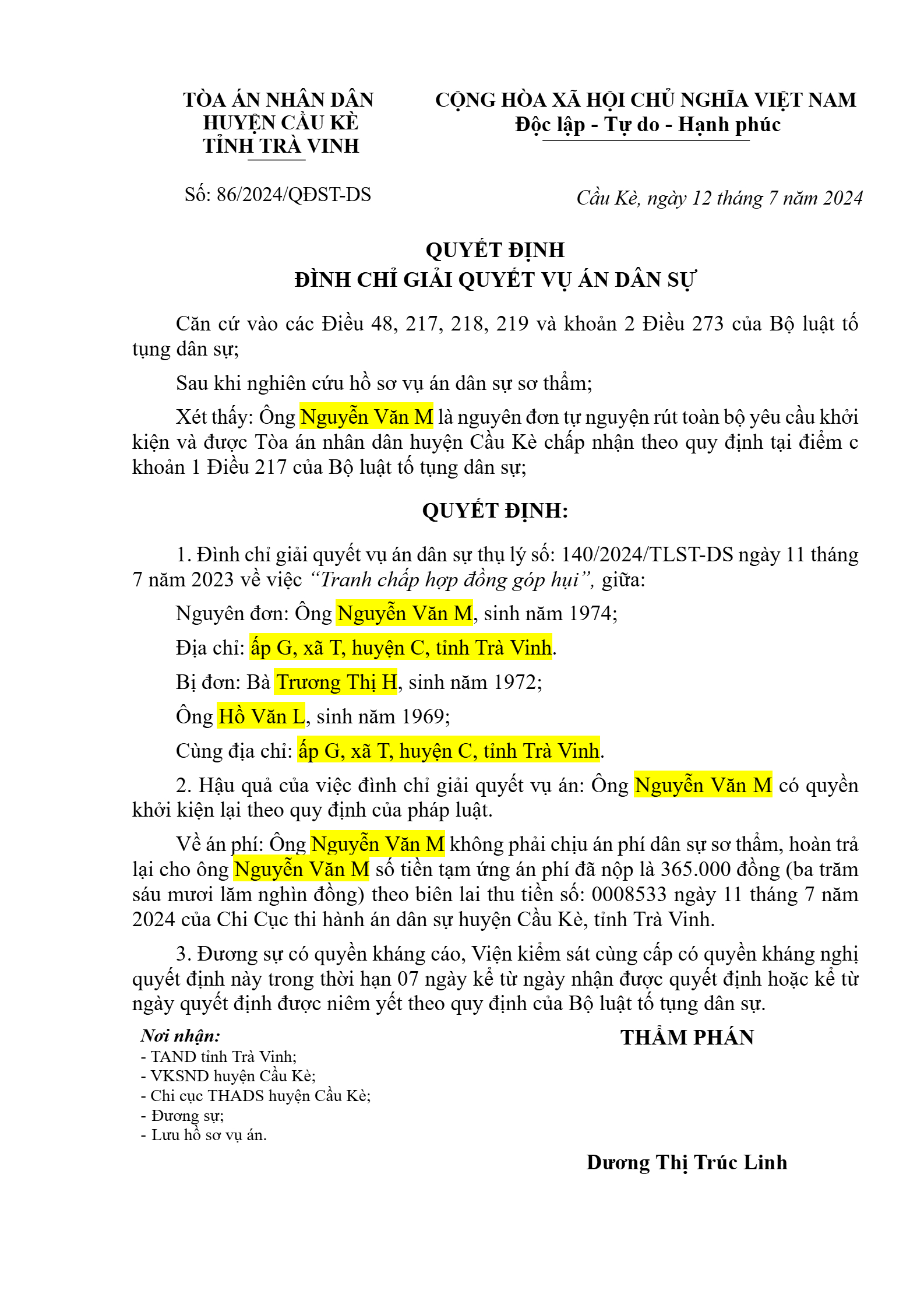 | Tòa án xét xử: | TAND huyện Cầu Kè (TAND tỉnh Trà Vinh) |