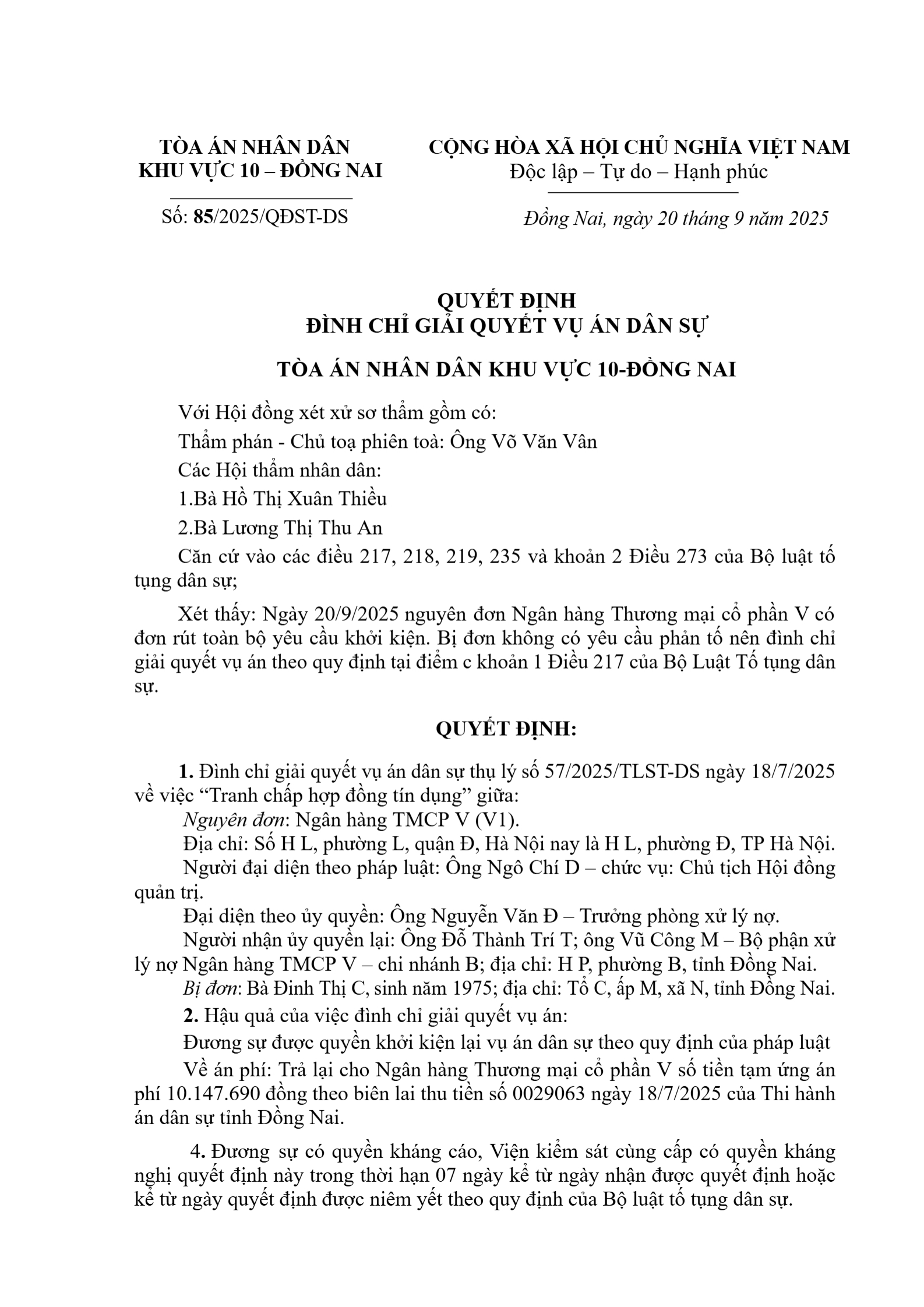 Quyết định số 85/2025/QĐST-DS ngày 20/10/2025 của Tòa án nhân dân khu vực 10 - Đồng Nai, tỉnh Đồng Nai về tranh chấp hợp đồng tín dụng