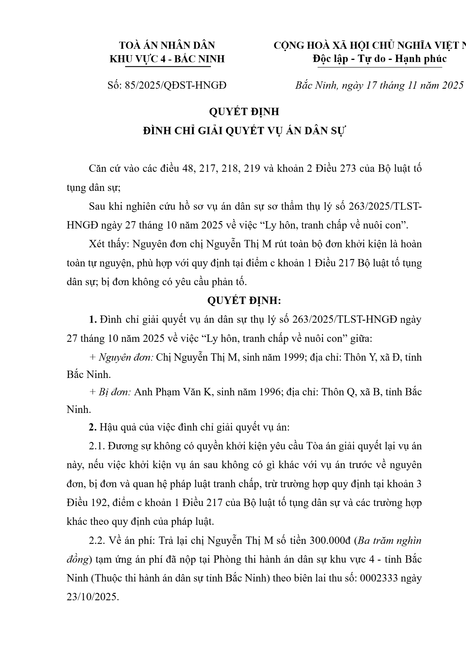 Quyết định số 85/2025/QĐST-HNGĐ ngày 17/11/2025 của Tòa án nhân dân khu vực 4 - Bắc Ninh, tỉnh Bắc Ninh về vụ án ly hôn về mâu thuẫn gia đình