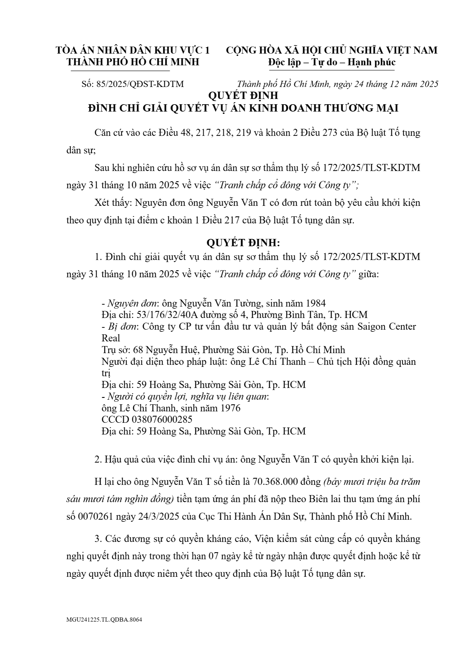 Quyết định số 85/2025/QĐST-KDTM ngày 24/12/2025 của Tòa án nhân dân khu vực 1 - Hồ Chí Minh, TP. Hồ Chí Minh về tranh chấp giữa công ty với các thành viên công ty