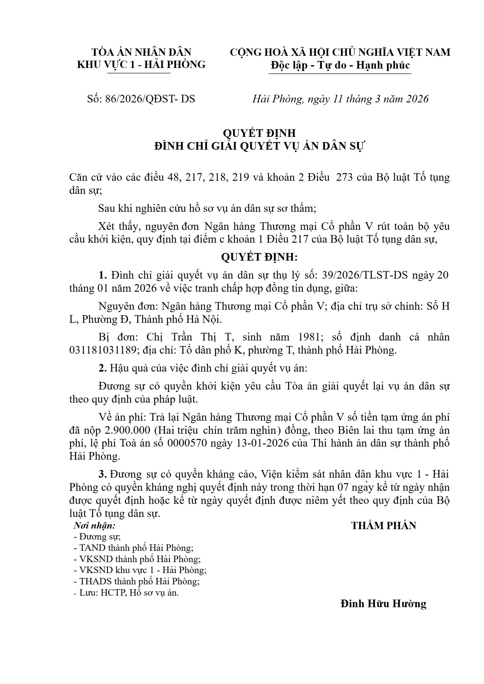Quyết định số 86/2026/QĐST-DS ngày 12/03/2026 của Tòa án nhân dân khu vực 1 - Hải Phòng, TP. Hải Phòng về tranh chấp hợp đồng tín dụng
