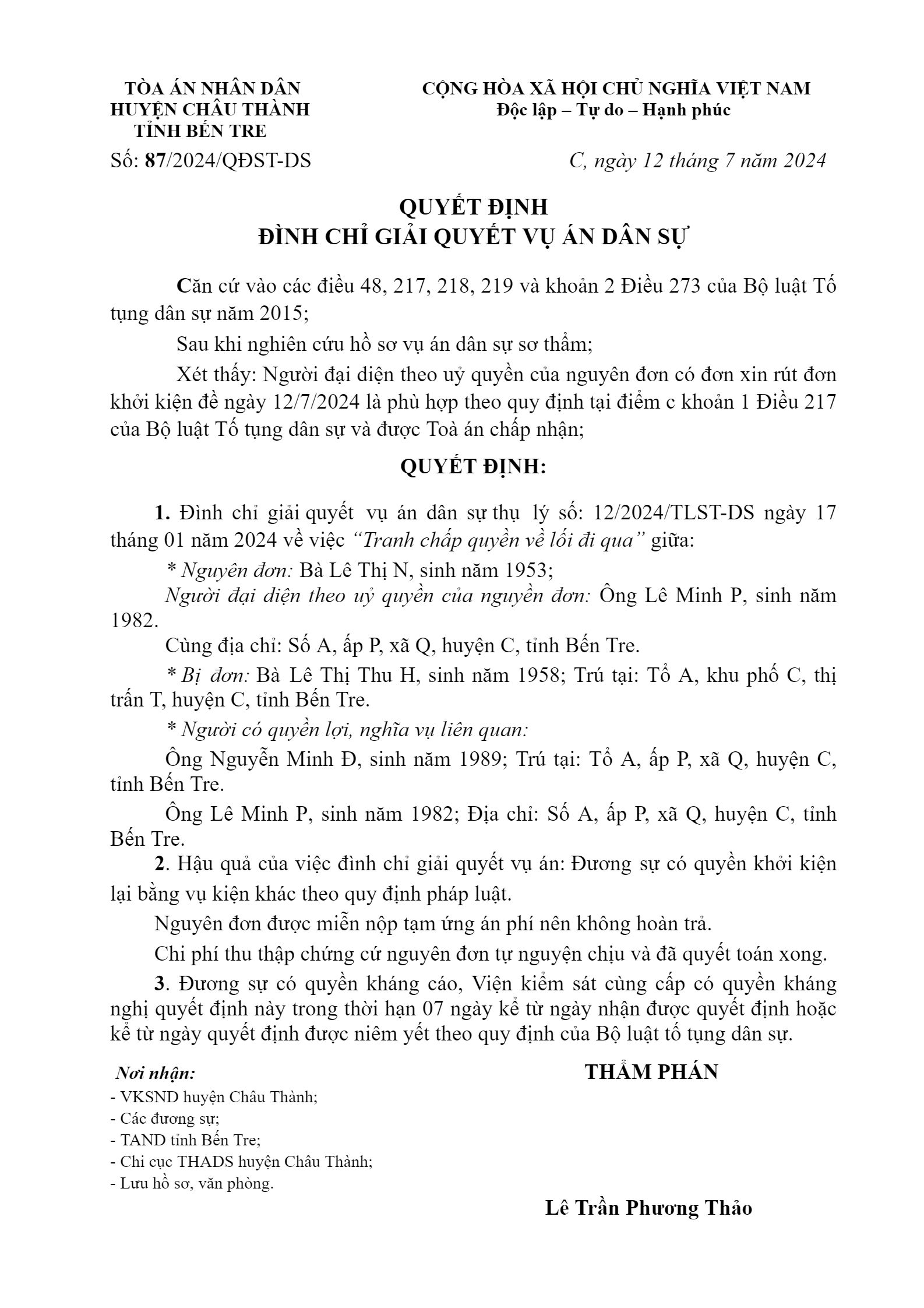 Quyết định số 87/2024/QĐST-DS ngày 12/07/2024 của TAND huyện Châu Thành A, tỉnh Hậu Giang về tranh chấp quyền sử dụng đất
