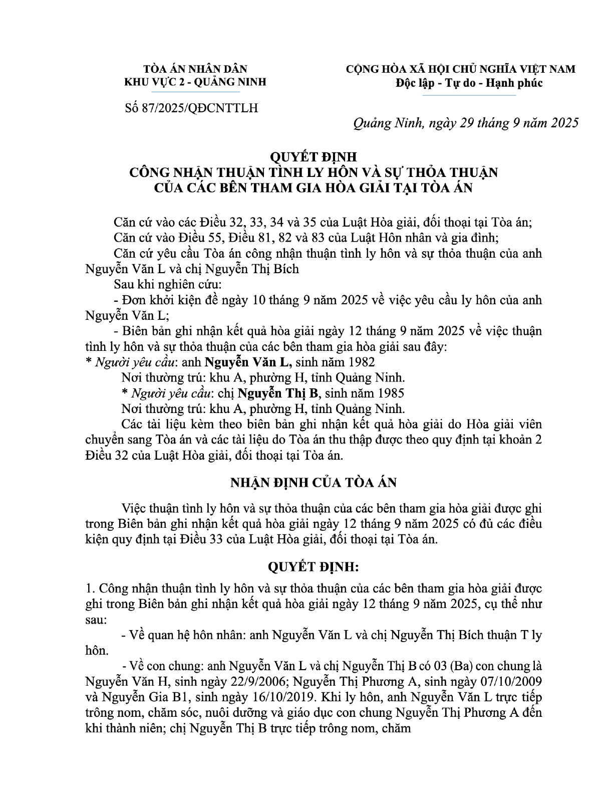 Quyết định số 87/2025/QĐCNTTLH ngày 29/09/2025 của Tòa án nhân dân khu vực 2 - Quảng Ninh, tỉnh Quảng Ninh về vụ án ly hôn về mâu thuẫn gia đình