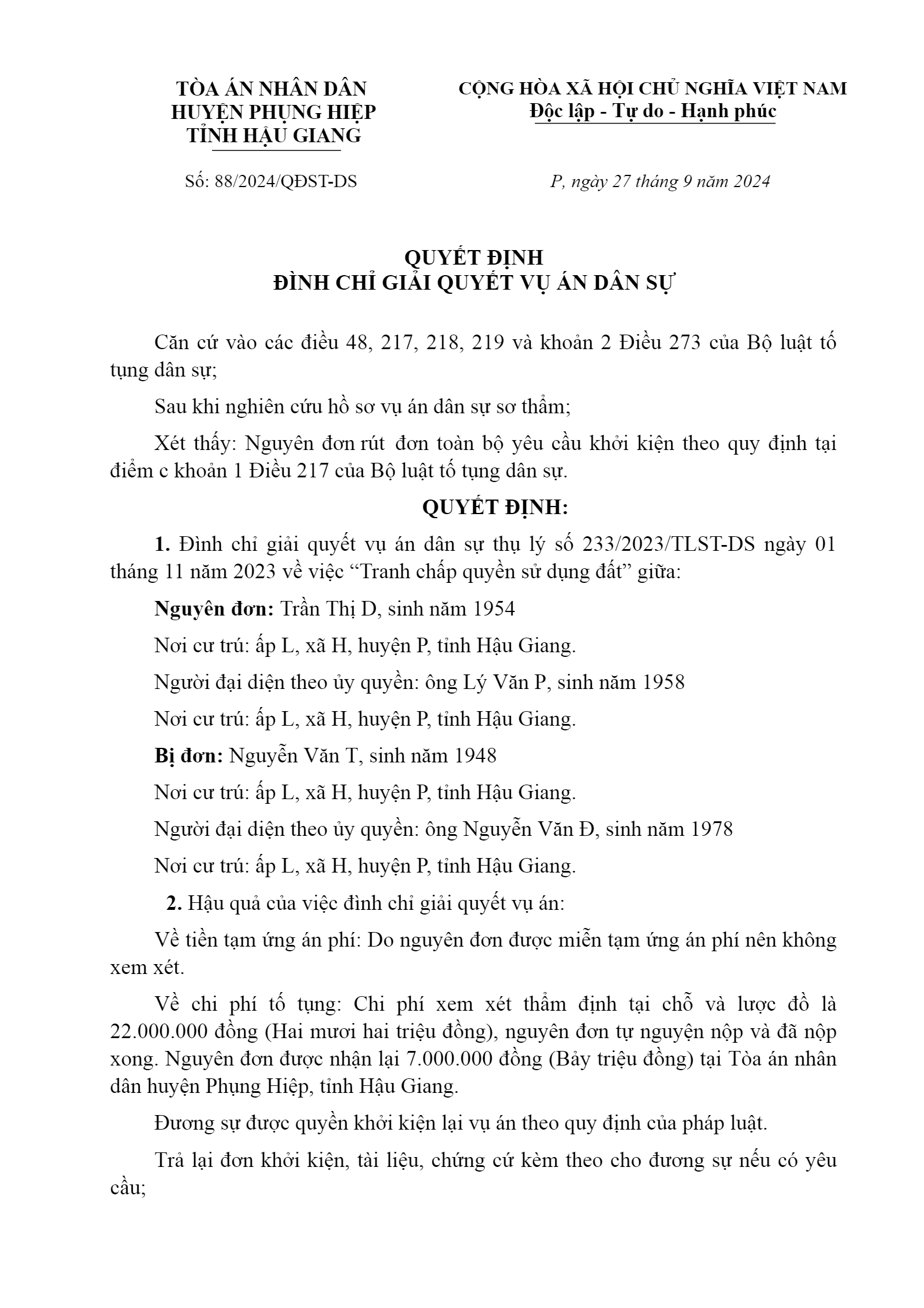 Quyết định số 88/2024/QĐST-DS ngày 27/09/2024 của TAND huyện Phụng Hiệp, tỉnh Hậu Giang về tranh chấp quyền sử dụng đất