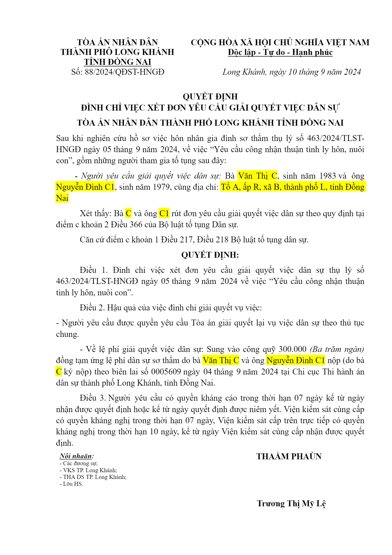 Quyết định số 88/2024/QĐST-HNGĐ ngày 10/09/2024 của TAND TX. Long Khánh, tỉnh Đồng Nai về vụ án ly hôn về mâu thuẫn gia đình