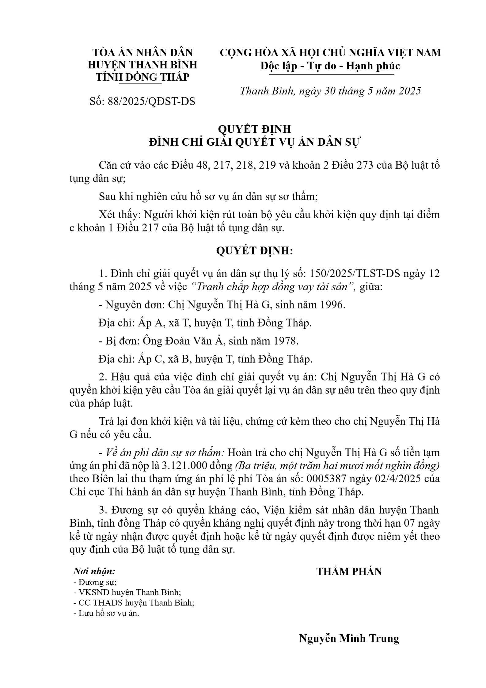 Quyết định số 88/2025/QĐST-DS ngày 30/05/2025 của TAND huyện Thanh Bình, tỉnh Đồng Tháp về tranh chấp hợp đồng vay tài sản